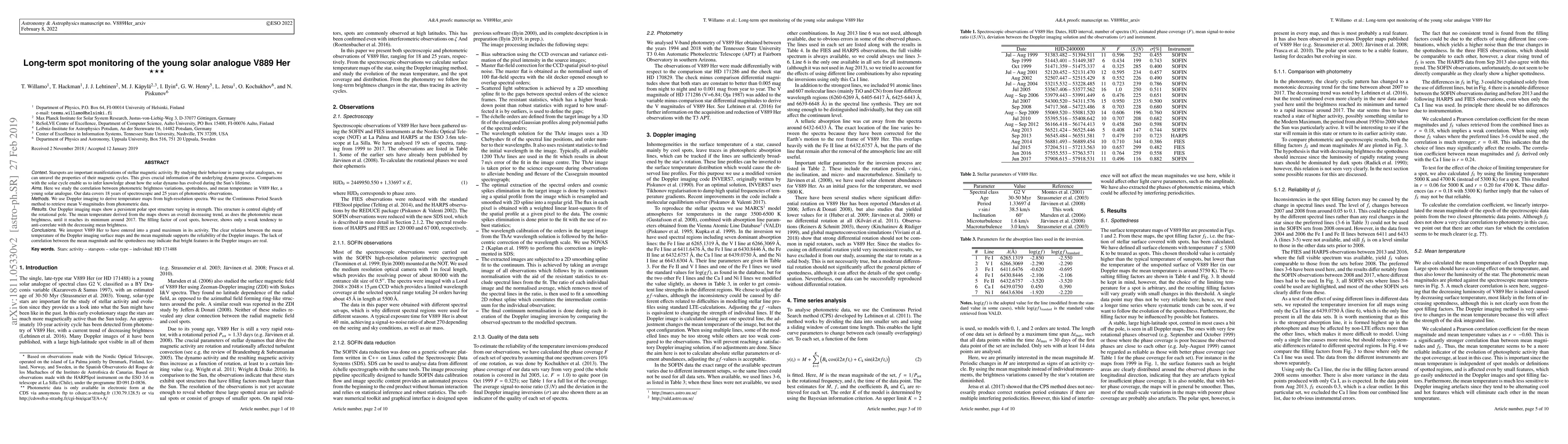 Researchers studied a young solar analogue, V889 Her, to understand its magnetic cycles and spot behavior. They found a persistent polar spot structure with decreasing temperature and brightness over 18 years, indicating an activity