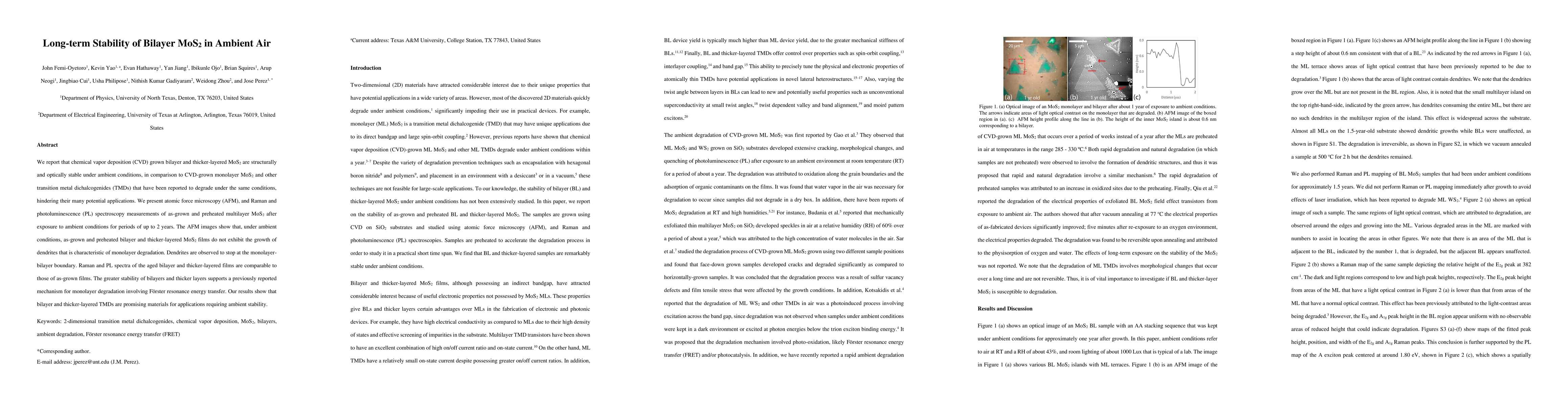 We report that chemical vapor deposition (CVD) grown bilayer and thicker-layered MoS2 are structurally and optically stable under ambient conditions, in comparison to CVD-grown monolayer MoS2 and other transition metal dichalcogenides (TMDs) that have been reported to degrade under the same conditions, hindering their many potential applications. We present atomic force microscopy (AFM), and Raman and photoluminescence (PL) spectroscopy measurements of as-grown and preheated multilayer MoS2 after exposure to ambient conditions for periods of up to 2 years. The AFM images show that, under ambient conditions, as-grown and preheated bilayer and thicker-layered MoS2 films do not exhibit the growth of dendrites that is characteristic of monolayer degradation. Dendrites are observed to stop at the monolayer-bilayer boundary. Raman and PL spectra of the aged bilayer and thicker-layered films are comparable to those of as-grown films. The greater stability of bilayers and thicker layers supports a previously reported mechanism for monolayer degradation involving F\"orster resonance energy transfer. Our results show that bilayer and thicker-layered TMDs are promising materials for applications requiring ambient stability.