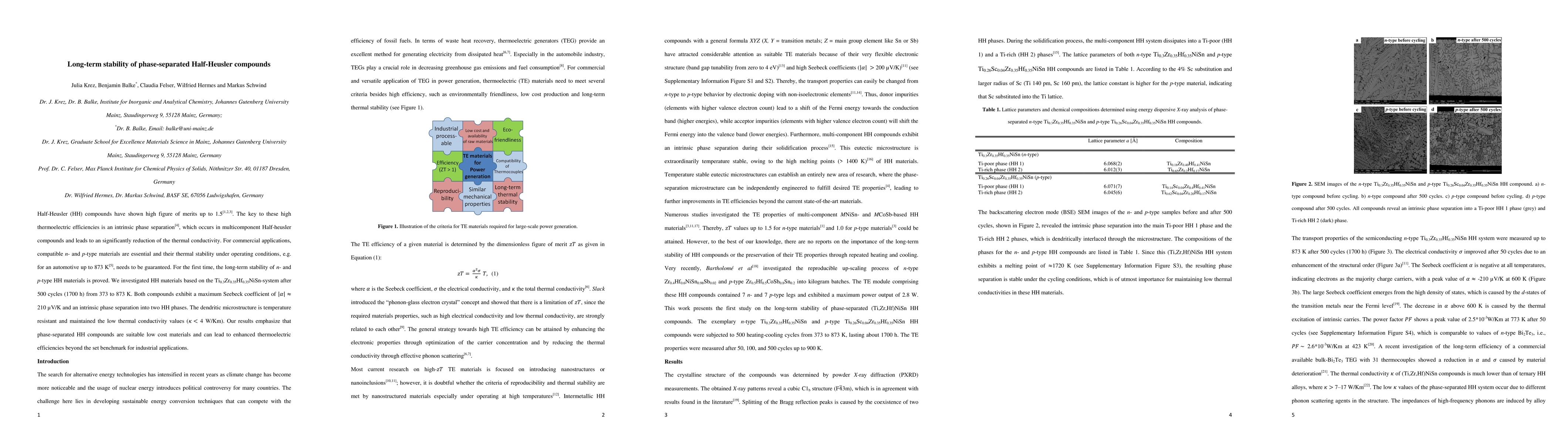 This study investigates the long-term thermal stability of phase-separated n- and p-type Half-Heusler compounds, demonstrating their potential for commercial thermoelectric applications. The Ti0.3Zr0.35Hf0.35NiSn-based materials maintained their low thermal conductivity and dendritic microstructure over 500 cycles, indicating suitability for high-temperature operations.