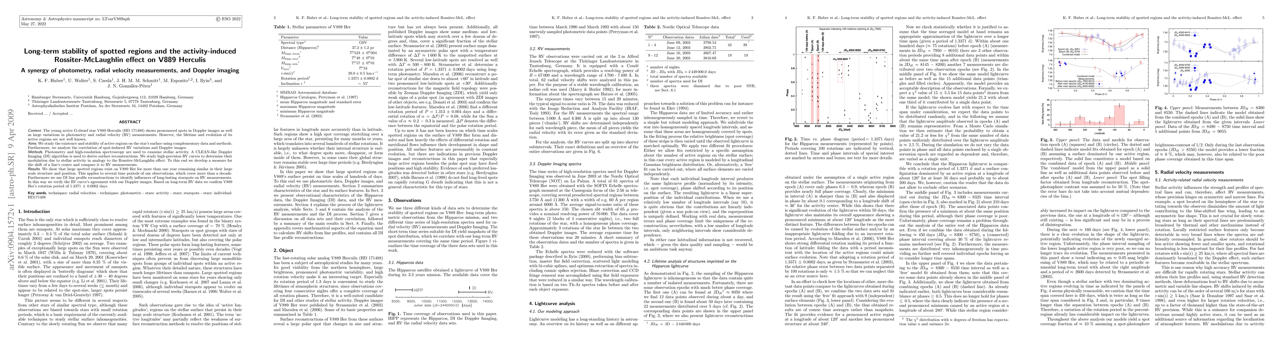 The young active G-dwarf star V889 Herculis (HD 171488) shows pronounced spots in Doppler images as well as large variations in photometry and radial velocity (RV) measurements. However, the lifetime and evolution of its active regions are not well known. We study the existence and stability of active regions on the star's surface using complementary data and methods. Furthermore, we analyze the correlation of spot-induced RV variations and Doppler images. Photometry and high-resolution spectroscopy are used to examine stellar activity. A CLEAN-like Doppler Imaging (DI) algorithm is used to derive surface reconstructions. We study high-precision RV curves to determine their modulation due to stellar activity in analogy to the Rossiter-McLaughlin effect. To this end we develop a measure for the shift of a line's center and compare it to RV measurements. We show that large spotted regions exist on V889 Her for more than one year remaining similar in their large scale structure and position. This applies to several time periods of our observations, which cover more than a decade. Furthermore we use DI line profile reconstructions to identify influences of long-lasting starspots on RV measurements. In this way we verify the RV curve's agreement with our Doppler images. Based on long-term RV data we confirm V889 Her's rotation period of $1.3371 \pm 0.0002$ days.