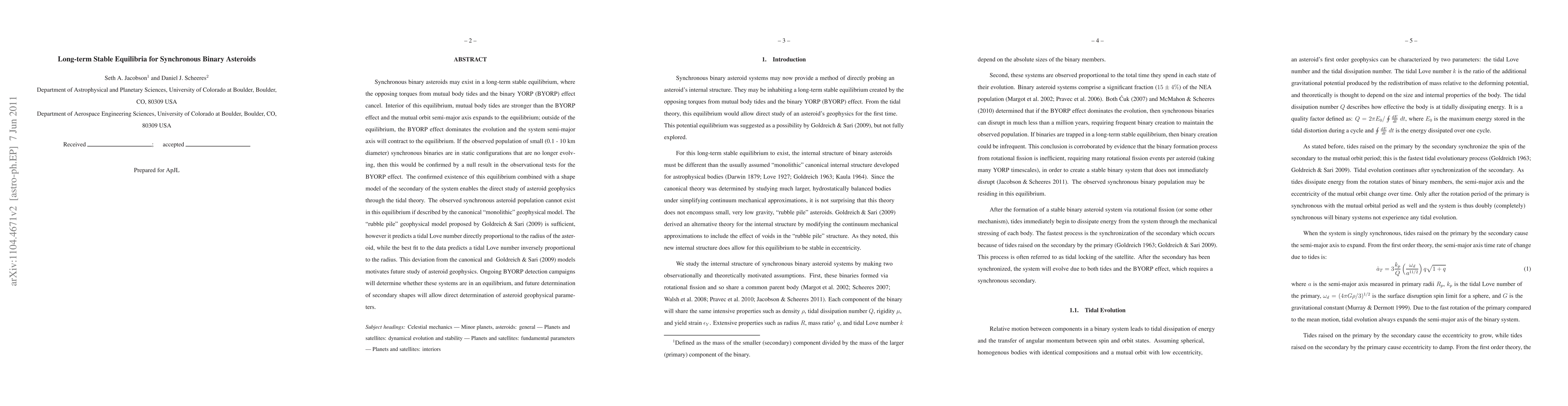 This study explores the long-term stable equilibrium of synchronous binary asteroids where tidal forces and the BYORP effect balance. It suggests that the observed synchronous binary population may confirm the existence of this equilibrium, enabling direct study of asteroid geophysics, though current models do not fully align with observed tidal Love numbers.