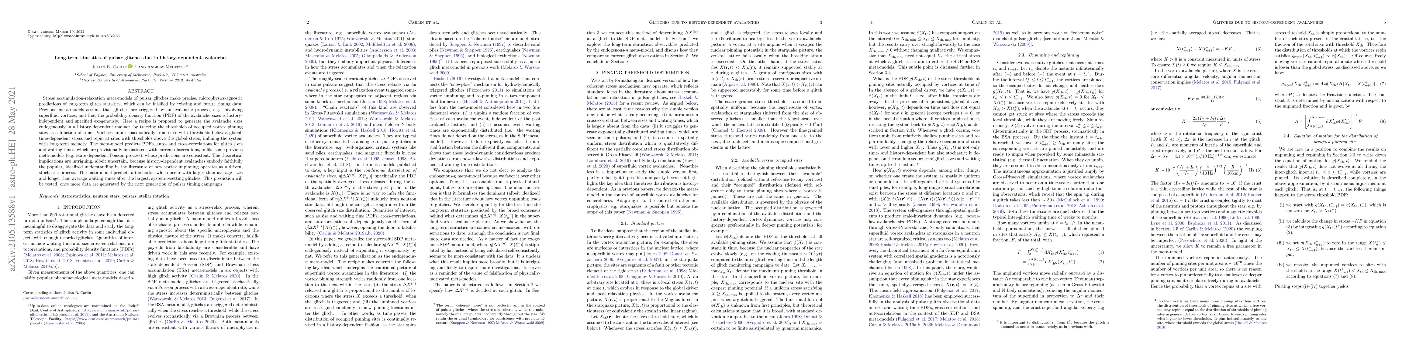 A new model predicts pulsar glitches occur through history-dependent avalanches, with larger and longer aftershocks following system-resetting events, offering a new understanding of the process.