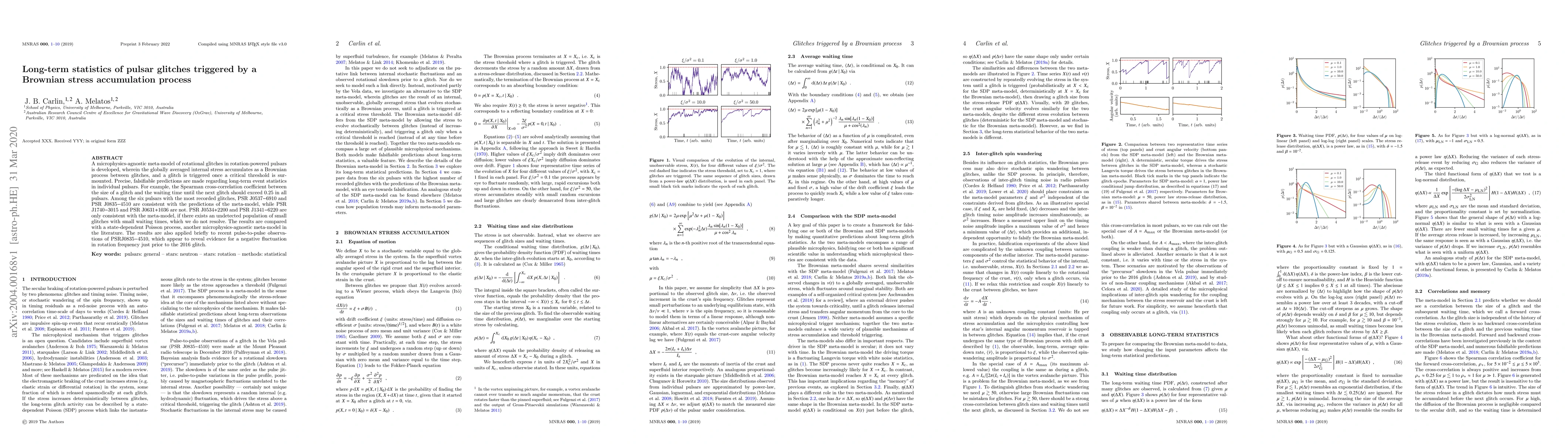 A microphysics-agnostic meta-model of rotational glitches in rotation-powered pulsars is developed, wherein the globally averaged internal stress accumulates as a Brownian process between glitches, and a glitch is triggered once a critical threshold is surmounted. Precise, falsifiable predictions are made regarding long-term event statistics in individual pulsars. For example, the Spearman cross-correlation coefficient between the size of a glitch and the waiting time until the next glitch should exceed 0.25 in all pulsars. Among the six pulsars with the most recorded glitches, PSR J0537$-$6910 and PSR J0835$-$4510 are consistent with the predictions of the meta-model, while PSR J1740$-$3015 and PSR J0631$+$1036 are not. PSR J0534$+$2200 and PSR J1341$-$6220 are only consistent with the meta-model, if there exists an undetected population of small glitches with small waiting times, which we do not resolve. The results are compared with a state-dependent Poisson process, another microphysics-agnostic meta-model in the literature. The results are also applied briefly to recent pulse-to-pulse observations of PSRJ0835$-$4510, which appear to reveal evidence for a negative fluctuation in rotation frequency just prior to the 2016 glitch.