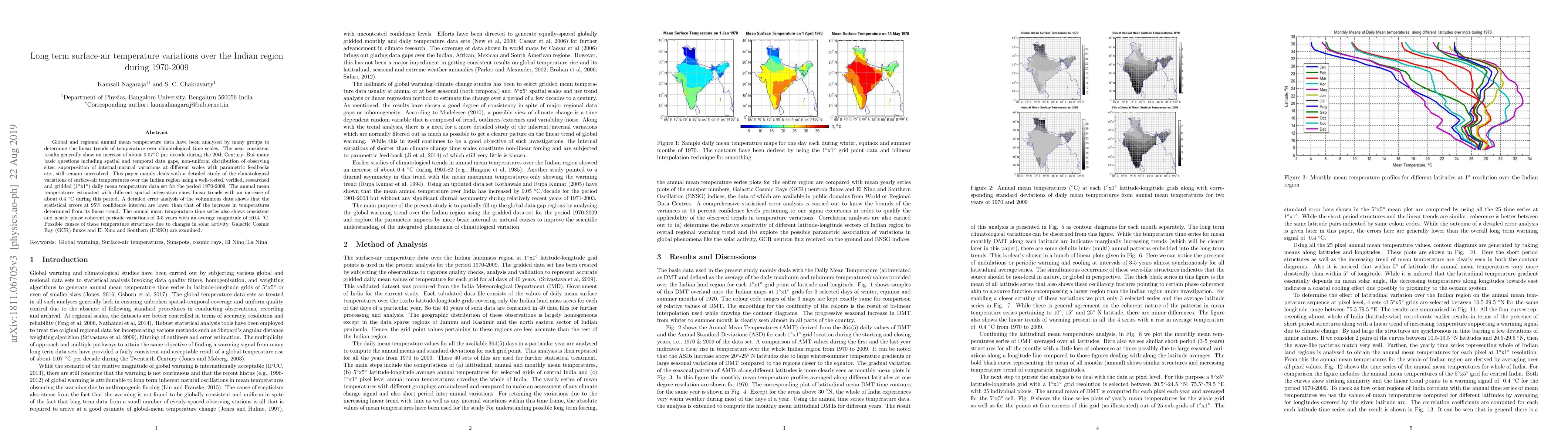 Global and regional annual mean temperature data have been analysed by many groups to determine the linear trends of temperature over climatological time scales. The near consistent results generally show an increase of about 0.07 {\deg}C per decade during the 20th Century. But many basic questions including spatial and temporal data gaps, non-uniform distribution of observing sites, superposition of internal/natural variations at different scales with parametric feedbacks etc., still remain unresolved. This paper mainly deals with a detailed study of the climatological variations of surface-air temperatures over the Indian region using a well-tested, verified, researched and gridded (1{\deg}x1{\deg}) daily mean temperature data set for the period 1970-2009. The annual mean temperatures estimated with different spatial integration show linear trends with an increase of about 0.4 {\deg}C during this period. A detailed error analysis of the voluminous data shows that the statistical errors at 95% confidence interval are lower than that of the increase in temperatures determined from its linear trend. The annual mean temperature time series also shows consistent and nearly phase coherent periodic variations of 3-5 years with an average magnitude of $\pm$0.4 {\deg}C. Possible causes of these temperature structures due to changes in solar activity, Galactic Cosmic Ray (GCR) fluxes and El Nino and Southern (ENSO) are examined.
