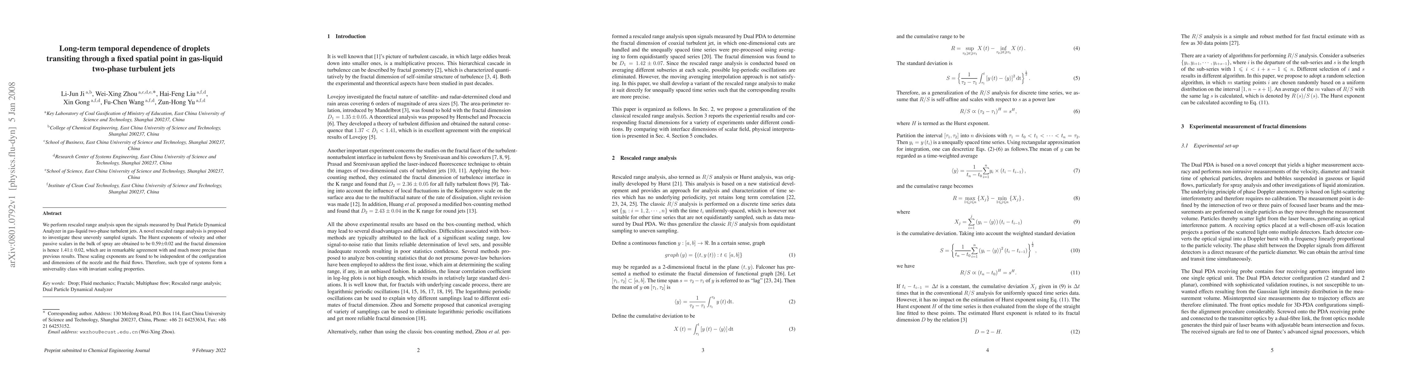 We perform rescaled range analysis upon the signals measured by Dual Particle Dynamical Analyzer in gas-liquid two-phase turbulent jets. A novel rescaled range analysis is proposed to investigate these unevenly sampled signals. The Hurst exponents of velocity and other passive scalars in the bulk of spray are obtained to be 0.59$\pm $0.02 and the fractal dimension is hence 1.41$\pm $ 0.02, which are in remarkable agreement with and much more precise than previous results. These scaling exponents are found to be independent of the configuration and dimensions of the nozzle and the fluid flows. Therefore, such type of systems form a universality class with invariant scaling properties.