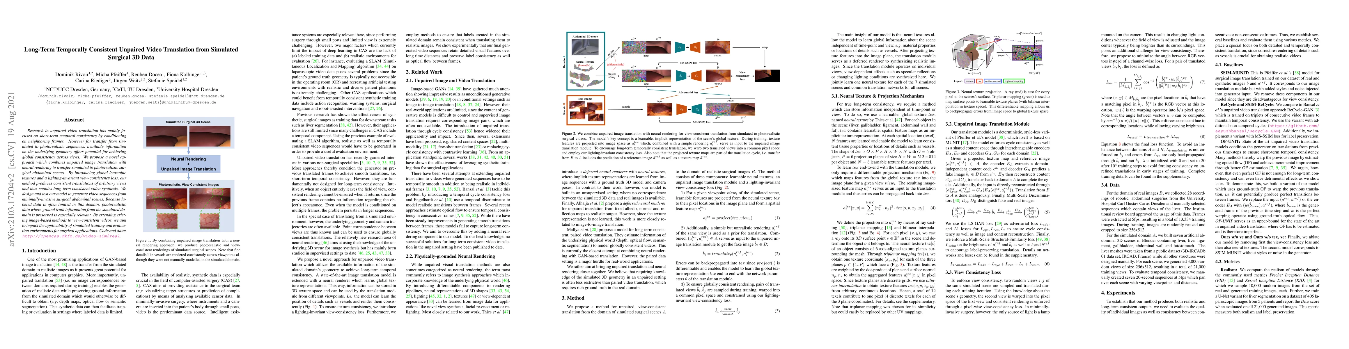 This paper proposes a novel approach for unpaired video translation that leverages neural rendering and global consistency to transfer simulated surgical 3D data to photorealistic sequences. The method achieves long-term temporal consistency across views by incorporating learnable textures and a view-consistency loss, enabling the generation of consistent video sequences from minimally-invasive surgical scenes.