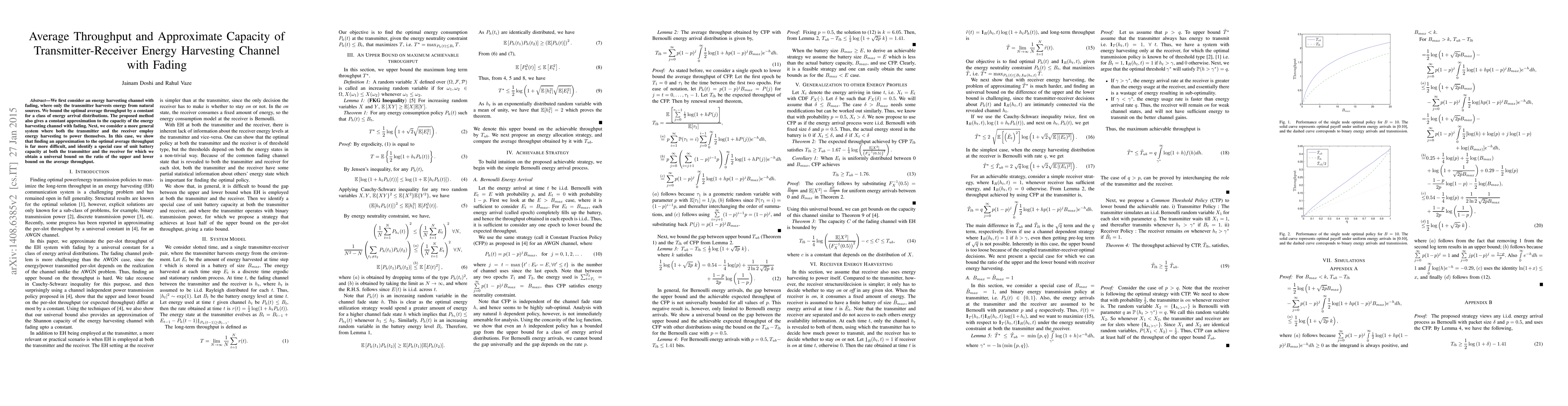 The paper analyzes an energy harvesting channel with fading, bounding the optimal long-term throughput by a constant for certain energy arrival distributions and providing a constant approximation to the channel capacity. It also explores a more complex system where both transmitter and receiver harvest energy.