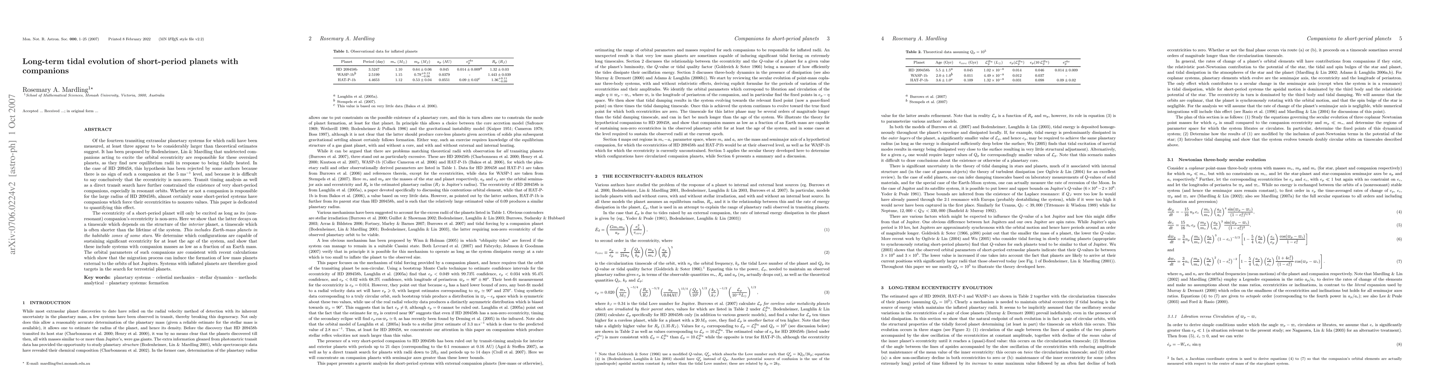 Of the fourteen transiting extrasolar planetary systems for which radii have been measured, at least three appear to be considerably larger than theoretical estimates suggest. It has been proposed by Bodenheimer, Lin & Mardling that undetected companions acting to excite the orbital eccentricity are responsible for these oversized planets, as they find new equilibrium radii in response to being tidally heated. In the case of HD 209458, this hypothesis has been rejected by some authors because there is no sign of such a companion at the 5 m/s level, and because it is difficult to say conclusively that the eccentricity is non-zero. Transit timing analysis [...]. Whether or not a companion is responsible for the large radius of HD 209458b, almost certainly some short-period systems have companions which force their eccentricities to nonzero values. This paper is dedicated to quantifying this effect. The eccentricity of a short-period planet will only be excited as long as its (non-resonant) companion's eccentricity is non-zero. Here we show that the latter decays on a timescale which depends on the structure of the interior planet, a timescale which is often shorter than the lifetime of the system. This includes Earth-mass planets in the habitable zones of some stars. We determine which configurations are capable of sustaining significant eccentricity for at least the age of the system, and show that these include systems with companion masses as low as a fraction of an Earth mass. The orbital parameters of such companions are consistent with recent calculations which show that the migration process can induce the formation of low mass planets external to the orbits of hot Jupiters. Systems with inflated planets are therefore good targets in the search for terrestrial planets.