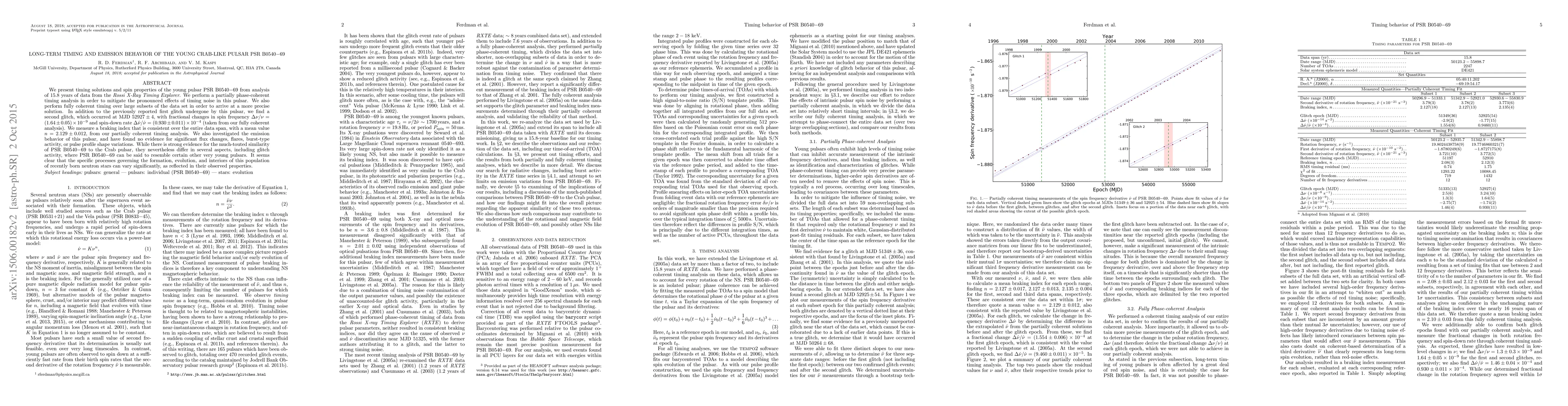 We present timing solutions and spin properties of the young pulsar PSR B0540-69 from analysis of 15.8 yr of data from the Rossi X-Ray Timing Explorer. We perform a partially phase-coherent timing analysis in order to mitigate the pronounced effects of timing noise in this pulsar. We also perform fully coherent timing over large subsets of the data set in order to arrive at a more precise solution. In addition to the previously reported first glitch undergone by this pulsar, we find a second glitch, which occurred at MJD 52927 $\pm$ 4, with fractional changes in spin frequency $\Delta\nu/\nu = (1.64 \pm 0.05) \times 10^{-9}$ and spin-down rate $\Delta\dot{\nu}/\dot{\nu} = (0.930 \pm 0.011) \times 10^{-4}$ (taken from our fully coherent analysis). We measure a braking index that is consistent over the entire data span, with a mean value $n = 2.129 \pm 0.012$, from our partially coherent timing analysis. We also investigated the emission behavior of this pulsar, and have found no evidence for significant flux changes, flares, burst-type activity, or pulse profile shape variations. While there is strong evidence for the much-touted similarity of PSR B0540-69 to the Crab pulsar, they nevertheless differ in several aspects, including glitch activity, where PSR B0540-69 can be said to resemble certain other very young pulsars. It seems clear that the specific processes governing the formation, evolution, and interiors of this population of recently born neutron stars can vary significantly, as reflected in their observed properties.