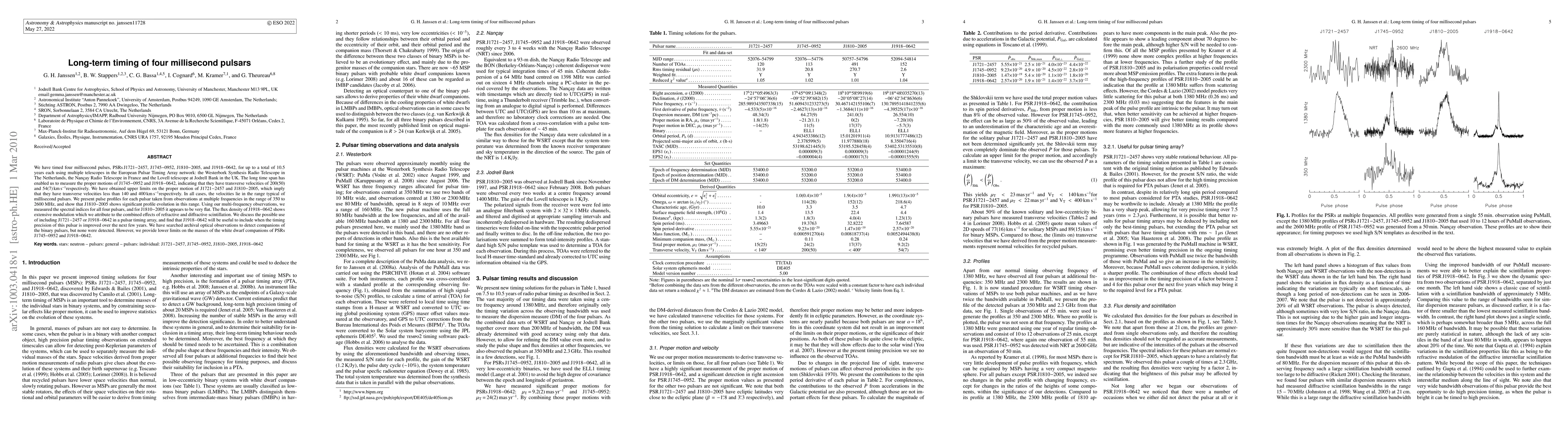 The research timed four millisecond pulsars (J1721-2457, J1745-0952, J1810-2005, J1918-0642) using the European Pulsar Timing Array network, including the Westerbork Synthesis Radio Telescope, Nancay Radio Telescope, and Lovell telescope at Jodrell Bank, over up to 10.5 years.
