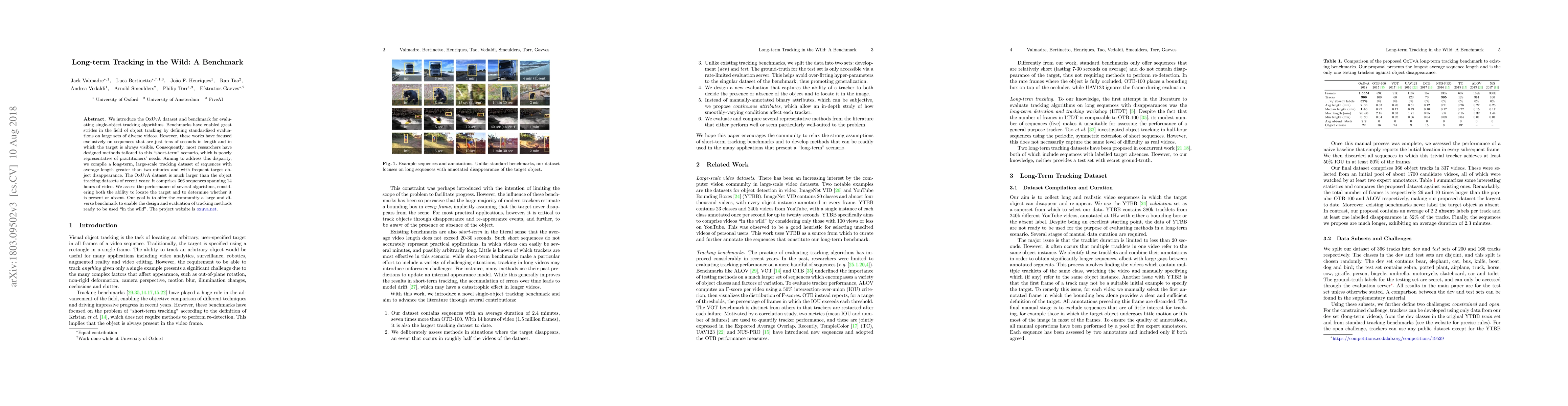 We introduce the OxUvA dataset and benchmark for evaluating single-object tracking algorithms. Benchmarks have enabled great strides in the field of object tracking by defining standardized evaluations on large sets of diverse videos. However, these works have focused exclusively on sequences that are just tens of seconds in length and in which the target is always visible. Consequently, most researchers have designed methods tailored to this "short-term" scenario, which is poorly representative of practitioners' needs. Aiming to address this disparity, we compile a long-term, large-scale tracking dataset of sequences with average length greater than two minutes and with frequent target object disappearance. The OxUvA dataset is much larger than the object tracking datasets of recent years: it comprises 366 sequences spanning 14 hours of video. We assess the performance of several algorithms, considering both the ability to locate the target and to determine whether it is present or absent. Our goal is to offer the community a large and diverse benchmark to enable the design and evaluation of tracking methods ready to be used "in the wild". The project website is http://oxuva.net