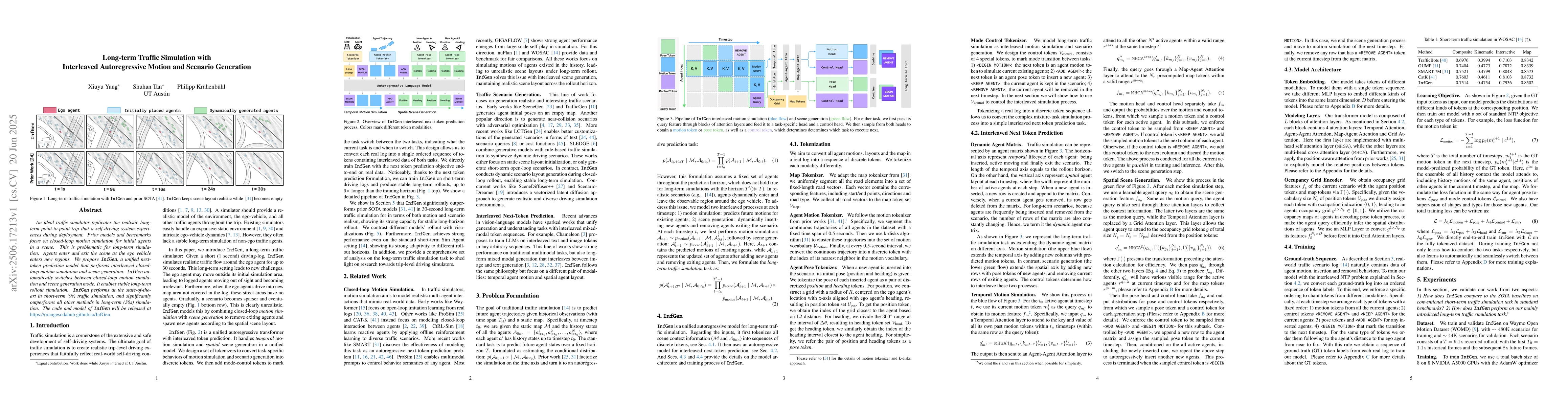 An ideal traffic simulator replicates the realistic long-term point-to-point trip that a self-driving system experiences during deployment. Prior models and benchmarks focus on closed-loop motion simulation for initial agents in a scene. This is problematic for long-term simulation. Agents enter and exit the scene as the ego vehicle enters new regions. We propose InfGen, a unified next-token prediction model that performs interleaved closed-loop motion simulation and scene generation. InfGen automatically switches between closed-loop motion simulation and scene generation mode. It enables stable long-term rollout simulation. InfGen performs at the state-of-the-art in short-term (9s) traffic simulation, and significantly outperforms all other methods in long-term (30s) simulation. The code and model of InfGen will be released at https://orangesodahub.github.io/InfGen