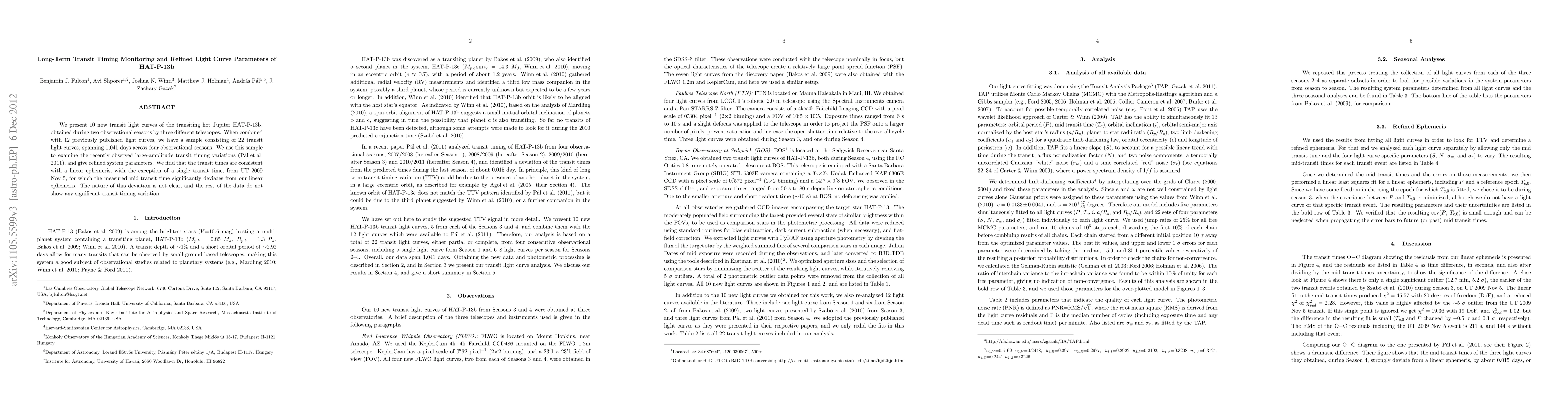 We present 10 new transit light curves of the transiting hot Jupiter HAT-P-13b, obtained during two observational seasons by three different telescopes. When combined with 12 previously published light curves, we have a sample consisting of 22 transit light curves, spanning 1,041 days across four observational seasons. We use this sample to examine the recently observed large-amplitude transit timing variations (P\'al et al. 2011), and give refined system parameters. We find that the transit times are consistent with a linear ephemeris, with the exception of a single transit time, from UT 2009 Nov 5, for which the measured mid transit time significantly deviates from our linear ephemeris. The nature of this deviation is not clear, and the rest of the data does not show any significant transit timing variation.