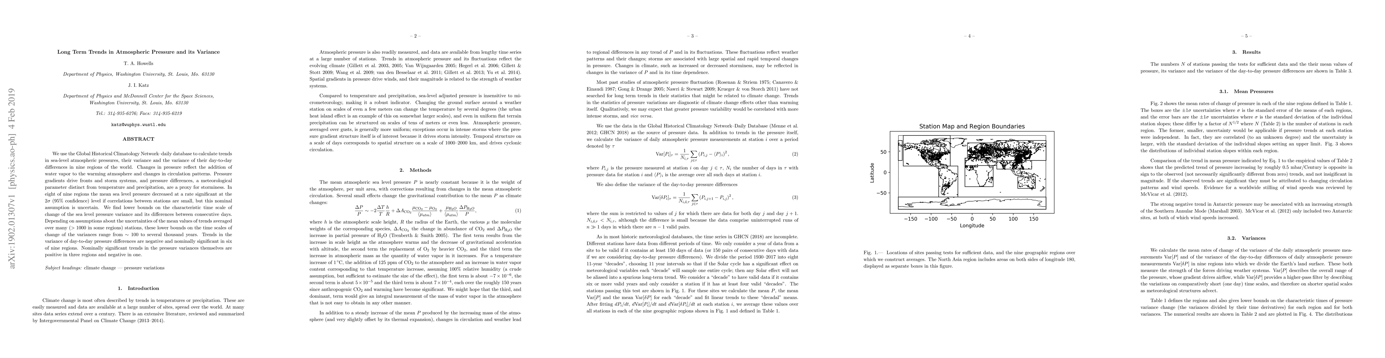 We use the Global Historical Climatology Network--daily database to calculate trends in sea-level atmospheric pressures, their variance and the variance of their day-to-day differences in nine regions of the world. Changes in pressure reflect the addition of water vapor to the warming atmosphere and changes in circulation patterns. Pressure gradients drive fronts and storm systems, and pressure differences, a meteorological parameter distinct from temperature and precipitation, are a proxy for storminess. In eight of nine regions the mean sea level pressure decreased at a rate significant at the $2\sigma$ (95\% confidence) level if correlations between stations are small, but this nominal assumption is uncertain. We find lower bounds on the characteristic time scale of change of the sea level pressure variance and its differences between consecutive days. Depending on assumptions about the uncertainties of the mean values of trends averaged over many ($> 1000$ in some regions) stations, these lower bounds on the time scales of change of the variances range from $\sim 100$ to several thousand years. Trends in the variance of day-to-day pressure differences are negative and nominally significant in six of nine regions. Nominally significant trends in the pressure variances themselves are positive in three regions and negative in one.