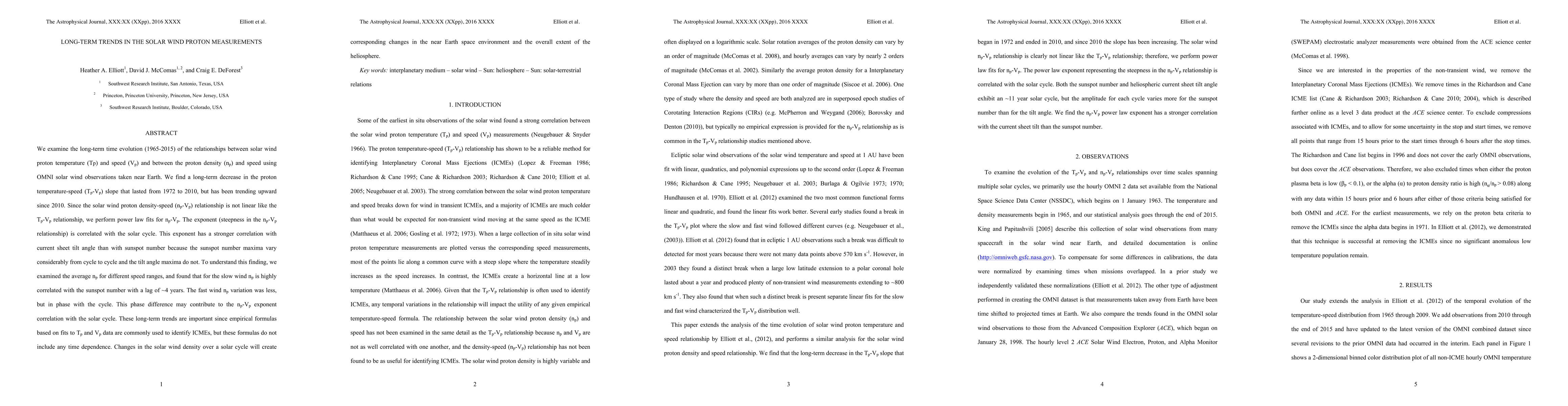 Long-term trends in solar wind proton temperature and speed measurements show a decreasing trend from 1972 to 2010, but an increasing trend since 2010. Changes in the solar wind density over a solar cycle affect the near Earth space environment.
