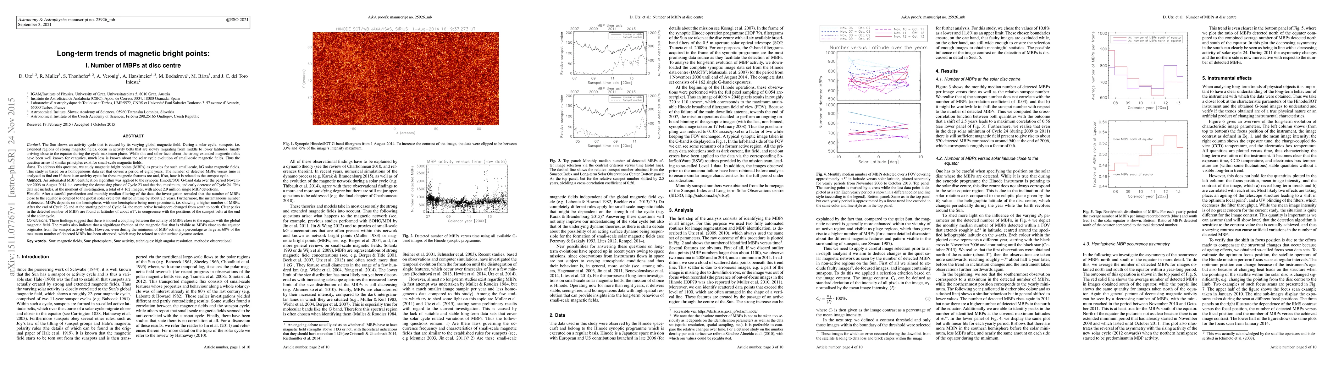 This study, using Hinode/SOT G-band data from 2006-2014, found that the number of magnetic bright points (MBPs) near the Sun's equator correlates with the solar cycle but lags by about 2.5 years. The active hemisphere for MBPs shifted from south to north at the start of Solar Cycle 24, indicating a link between global magnetic field activity and these small-scale magnetic fields.