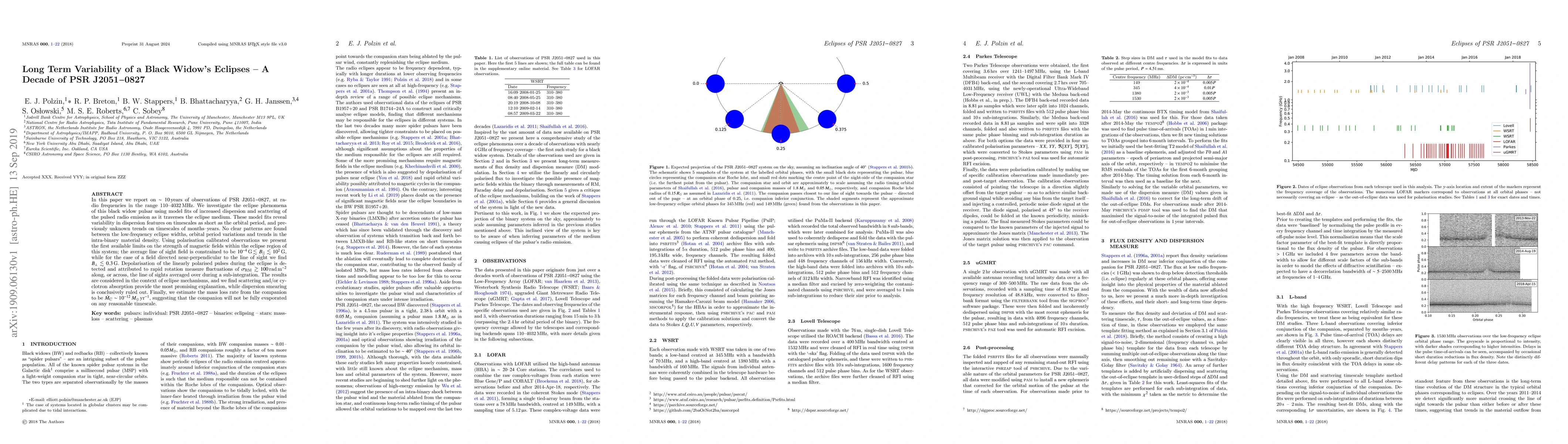 This paper reports on a decade of radio observations of PSR J2051$-$0827, revealing variability in eclipse phenomena and trends over months-years, while ruling out dispersion smearing as an explanation. The study estimates the companion's mass loss rate and finds no clear correlation between eclipse widths and orbital period variations.