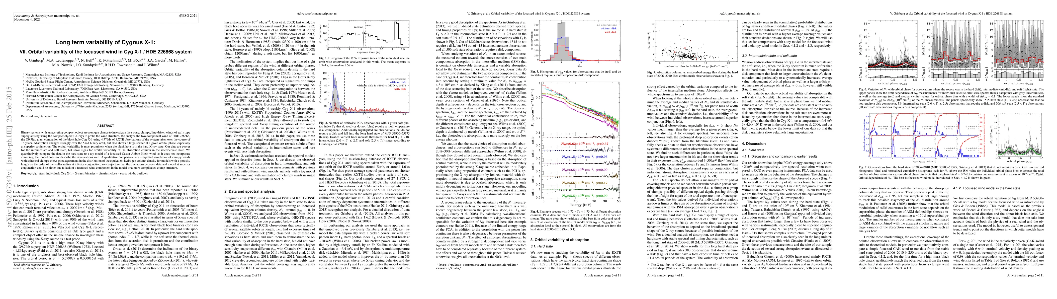 Binary systems with an accreting compact object are a unique chance to investigate the strong, clumpy, line-driven winds of early type supergiants by using the compact object's X-rays to probe the wind structure. We analyze the two-component wind of HDE 226868, the O9.7Iab giant companion of the black hole Cyg X-1 using 4.77 Ms of RXTE observations of the system taken over the course of 16 years. Absorption changes strongly over the 5.6 d binary orbit, but also shows a large scatter at a given orbital phase, especially at superior conjunction. The orbital variability is most prominent when the black hole is in the hard X-ray state. Our data are poorer for the intermediate and soft state, but show signs for orbital variability of the absorption column in the intermediate state. We quantitatively compare the data in the hard state to a toy model of a focussed Castor-Abbott-Klein-wind: as it does not incorporate clumping, the model does not describe the observations well. A qualitative comparison to a simplified simulation of clumpy winds with spherical clumps shows good agreement in the distribution of the equivalent hydrogen column density for models with a porosity length on the order of the stellar radius at inferior conjunction; we conjecture that the deviations between data and model at superior conjunction could be either due to lack of a focussed wind component in the model or a more complicated clump structure.
