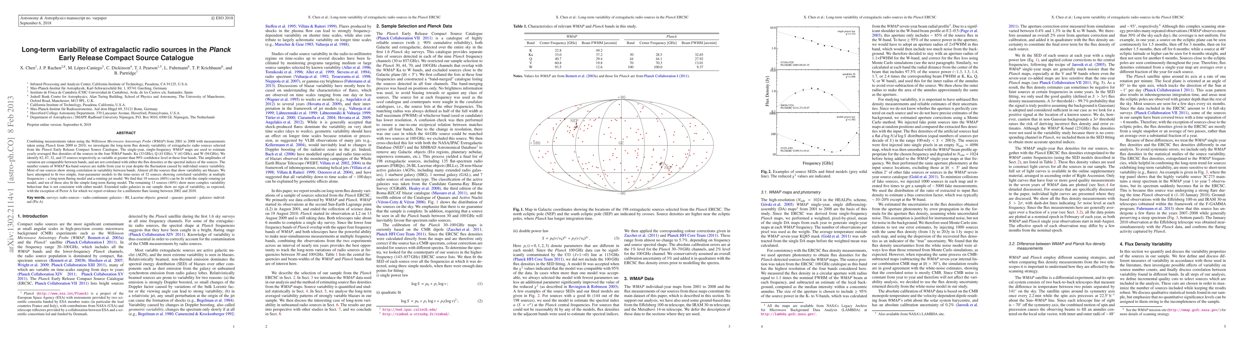 This study combines WMAP and Planck data to analyze the long-term flux density variability of extragalactic radio sources from the Planck catalogue. Most variable sources, predominantly blazars, show correlated variability across different frequencies, with 60% fitting a rotating-jet model. Extended radio galaxies show little variability, except for Pictor A, which experienced a millimeter flare.