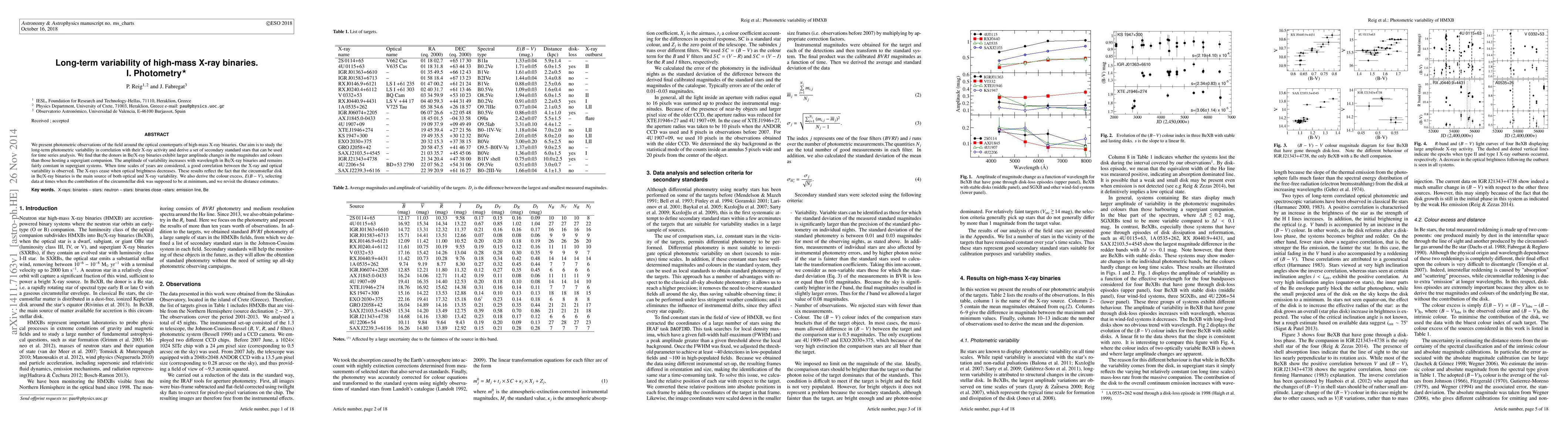 We present photometric observations of the field around the optical counterparts of high-mass X-ray binaries. Our aim is to study the long-term photometric variability in correlation with their X-ray activity and derive a set of secondary standard stars that can be used for time series analysis. We find that the donors in Be/X-ray binaries exhibit larger amplitude changes in the magnitudes and colours than those hosting a supergiant companion. The amplitude of variability increases with wavelength in Be/X-ray binaries and remains fairly constant in supergiant systems. When time scales of years are considered, a good correlation between the X-ray and optical variability is observed. The X-rays cease when optical brightness decreases. These results reflect the fact that the circumstellar disk in Be/X-ray binaries is the main source of both optical and X-ray variability. We also derive the colour excess, E(B-V), selecting data at times when the contribution of the circumstellar disk was supposed to be at minimum, and we revisit the distance estimates.