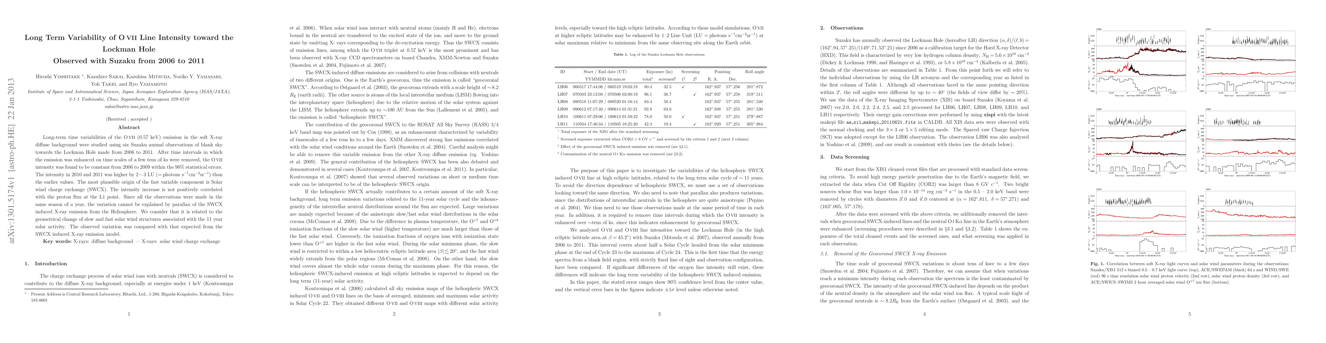 Long-term time variabilities of the OVII (0.57 keV) emission in the soft X-ray diffuse background were studied using six Suzaku annual observations of blank sky towards the Lockman Hole made from 2006 to 2011. After time intervals in which the emission was enhanced on time scales of a few tens of ks were removed, the O VII intensity was found to be constant from 2006 to 2009 within the 90% statistical errors. The intensity in 2010 and 2011 was higher by 2-3 LU (photons/s/cm/sr) than the earlier values. The most plausible origin of the fast variable component is Solar wind charge exchange (SWCX). The intensity increase is not positively correlated with the proton flux at the L1 point. Since all the observations were made in the same season of a year, the variation cannot be explained by parallax of the SWCX induced X-ray emission from the Heliosphere. We consider that it is related to the geometrical change of slow and fast solar wind structures associated with the 11 year solar activity. The observed variation was compared with that expected from the SWCX induced X-ray emission model.