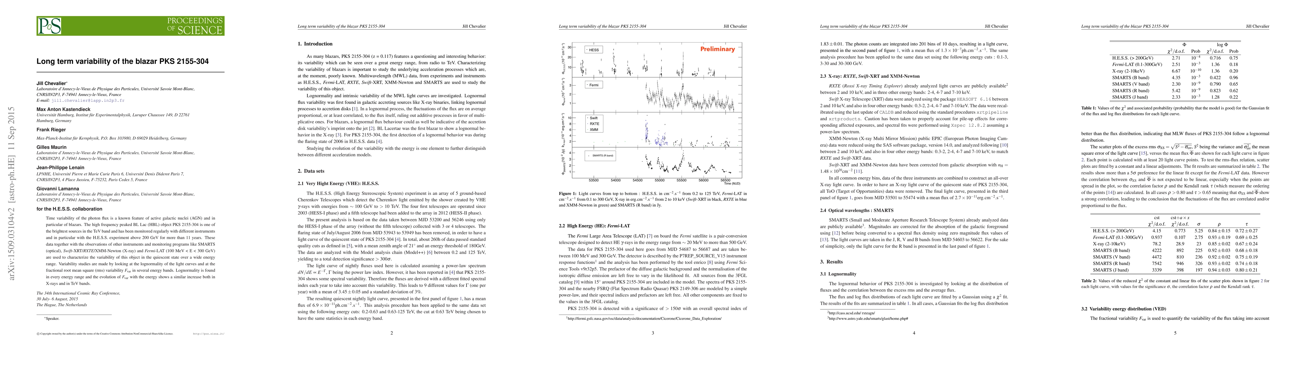 Time variability of the photon flux is a known feature of active galactic nuclei (AGN) and in particular of blazars. The high frequency peaked BL Lac (HBL) object PKS 2155-304 is one of the brightest sources in the TeV band and has been monitored regularly with different instruments and in particular with the H.E.S.S. experiment above 200 GeV for more than 11 years. These data together with the observations of other instruments and monitoring programs like SMARTS (optical), Swift-XRT/RXTE/XMM-Newton (X-ray) and Fermi-LAT (100 MeV < E < 300 GeV) are used to characterize the variability of this object in the quiescent state over a wide energy range. Variability studies are made by looking at the lognormality of the light curves and at the fractional root mean square (rms) variability Fvar in several energy bands. Lognormality is found in every energy range and the evolution of Fvar with the energy shows a similar increase both in X-rays and in TeV bands.