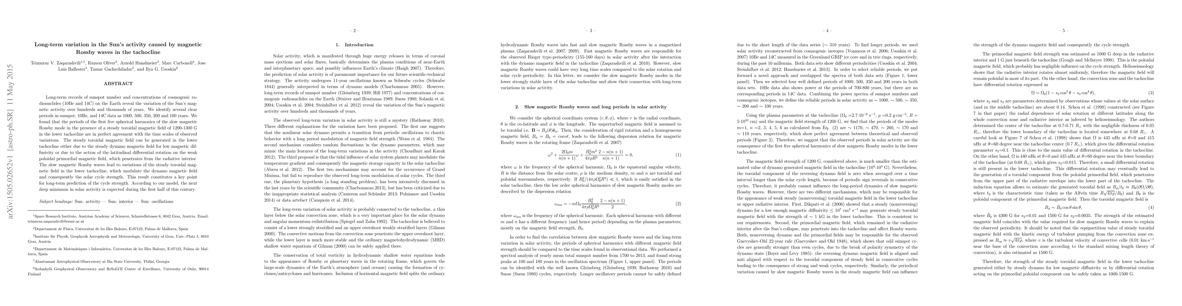 This paper identifies long-term variations in the Sun's magnetic activity, correlating them with magnetic Rossby waves in the tachocline, and predicts a deep minimum in solar activity in the first half of this century. The study uses sunspot records and cosmogenic radionuclides to match observed periods with theoretical models of magnetic Rossby waves.