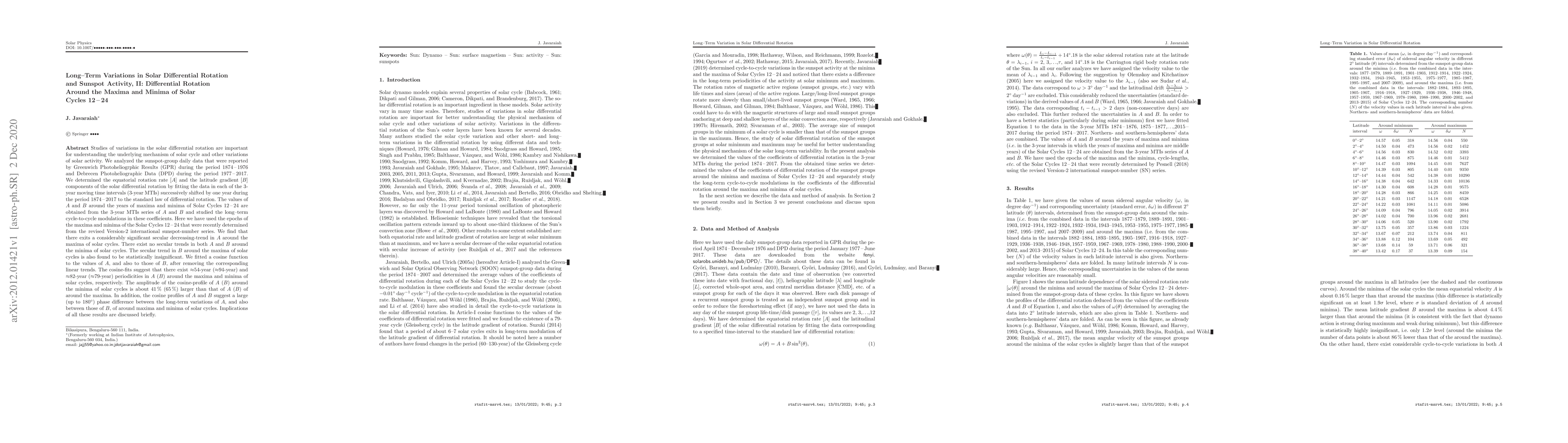 This paper analyzes long-term variations in solar differential rotation and sunspot activity from 1874-2017, finding significant secular decreases in equatorial rotation rate around solar maxima, but no trends around minima. It also identifies periodicities and phase differences in differential rotation components, suggesting a 54-year cycle around solar maxima and a 82-year cycle around minima.