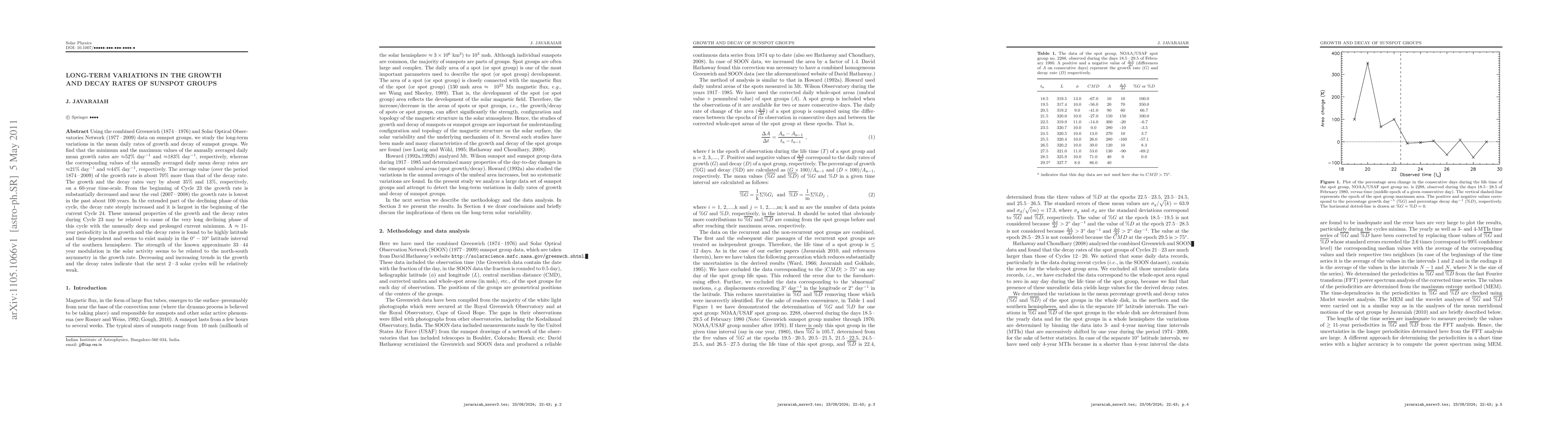 This study analyzes long-term variations in sunspot group growth and decay rates using data from 1874 to 2009, finding that growth rates peak at ~183% per day and decay rates at ~44% per day. The average growth rate is significantly higher than the decay rate, with both rates showing notable fluctuations over a 60-year timescale.