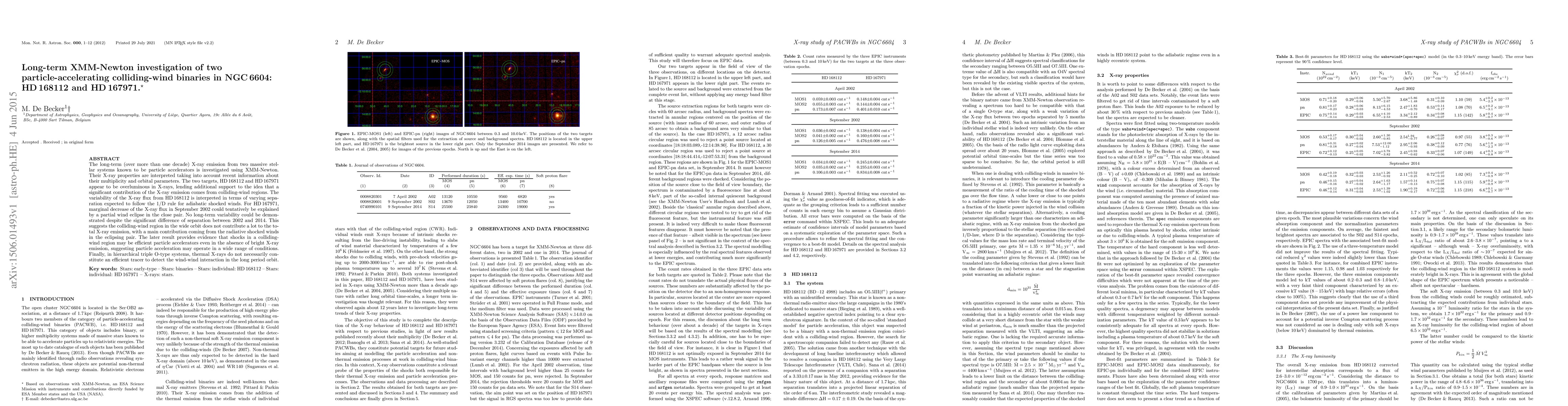 This study uses XMM-Newton data to analyze long-term X-ray emissions from two colliding-wind binaries, HD168112 and HD167971 in NGC6604, finding that HD168112 shows variable X-ray flux likely due to changing separation, while HD167971 shows minimal variability, suggesting the colliding-wind region in its wider orbit contributes less to X-ray emission than radiative shocked winds.