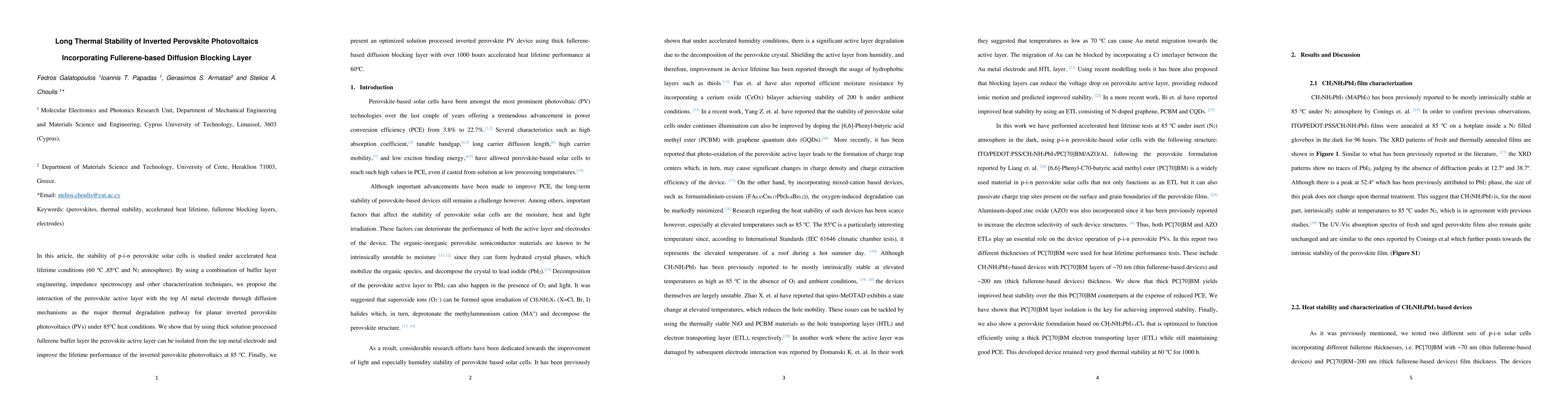 This paper investigates the thermal stability of inverted perovskite solar cells under accelerated heat conditions, identifying the interaction of the perovskite layer with the top metal electrode as a major degradation pathway. The use of a thick fullerene buffer layer effectively isolates the perovskite, significantly enhancing the device's lifetime performance, achieving over 1000 hours of stability at 60°C.