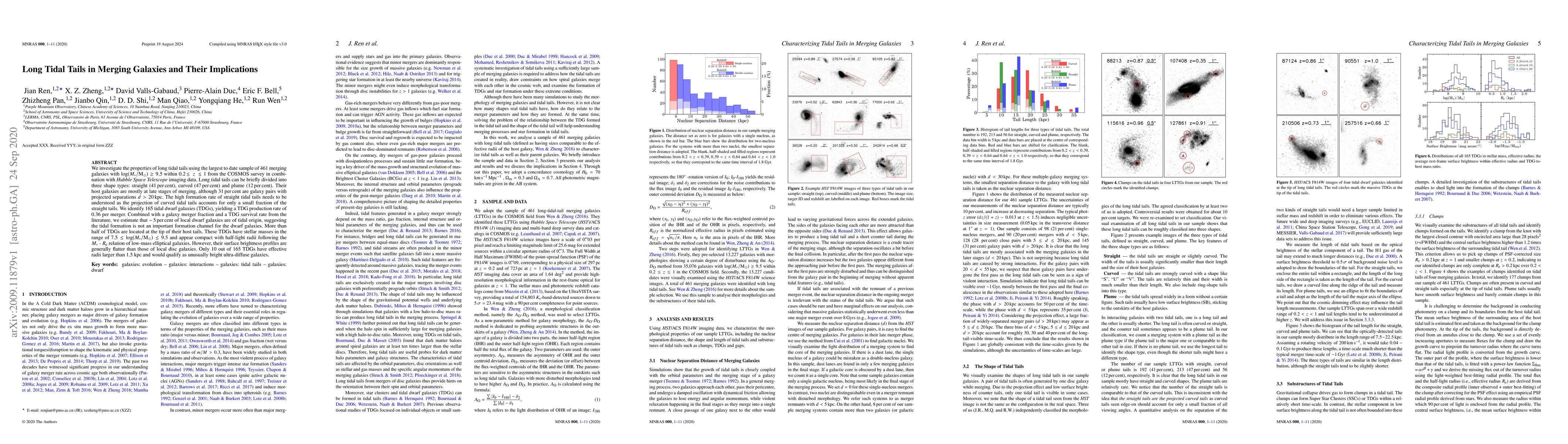 This study analyzes long tidal tails in 461 merging galaxies, finding three main tail shapes and a high rate of straight tails. It estimates that about 5% of local dwarf galaxies form from tidal interactions, with most tidal dwarf galaxies located at the tips of their host tails and exhibiting compact, low-mass characteristics.