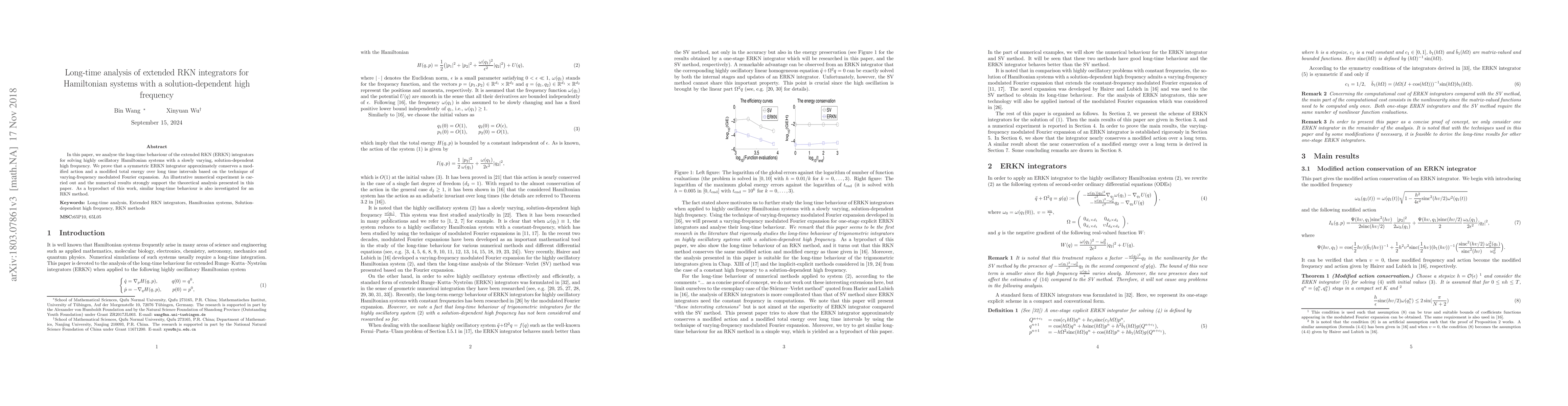 This paper analyzes the long-term performance of extended RKN (ERKN) integrators for solving highly oscillatory Hamiltonian systems with varying high frequencies. The study proves that a symmetric ERKN integrator conserves modified action and energy over extended periods, supported by numerical experiments.