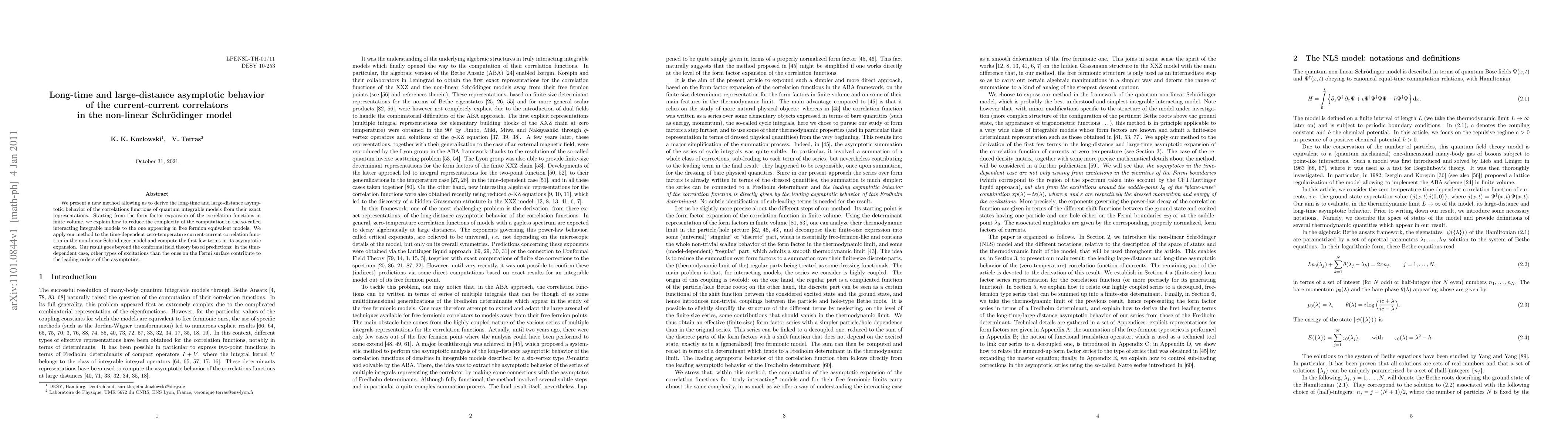 We present a new method allowing us to derive the long-time and large-distance asymptotic behavior of the correlations functions of quantum integrable models from their exact representations. Starting from the form factor expansion of the correlation functions in finite volume, we explain how to reduce the complexity of the computation in the so-called interacting integrable models to the one appearing in free fermion equivalent models. We apply our method to the time-dependent zero-temperature current-current correlation function in the non-linear Schr\"{o}dinger model and compute the first few terms in its asymptotic expansion. Our result goes beyond the conformal field theory based predictions: in the time-dependent case, other types of excitations than the ones on the Fermi surface contribute to the leading orders of the asymptotics.