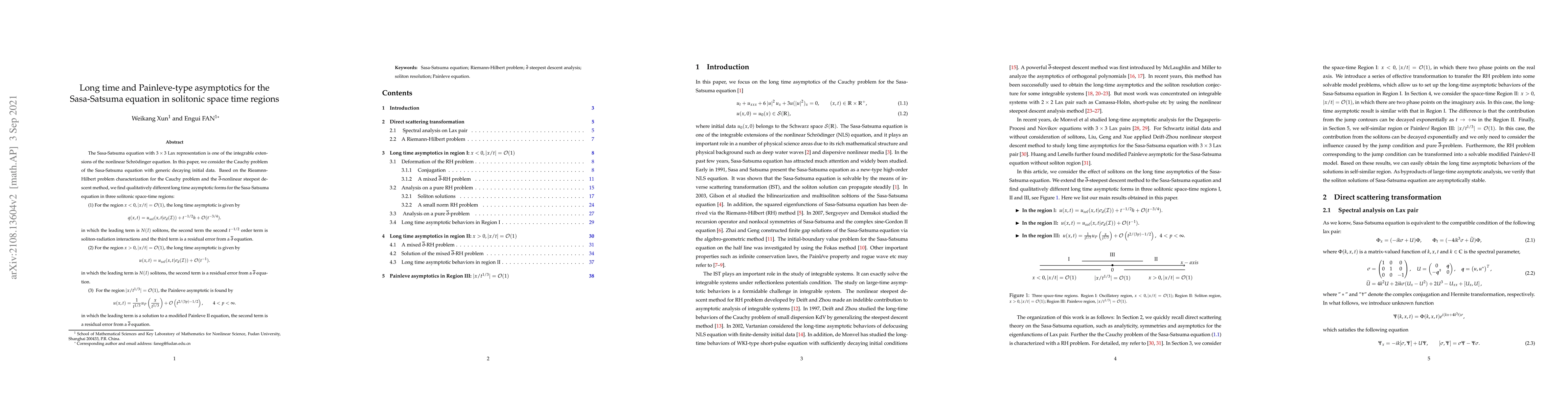 This research explores the long-term behavior of the Sasa-Satsuma equation using a Riemann-Hilbert problem and the $overline{partial}$-nonlinear steepest descent method. It identifies three distinct long time asymptotic forms for the equation in specific solitonic space-time regions, involving soliton behavior, radiation interactions, and Painleve asymptotics.