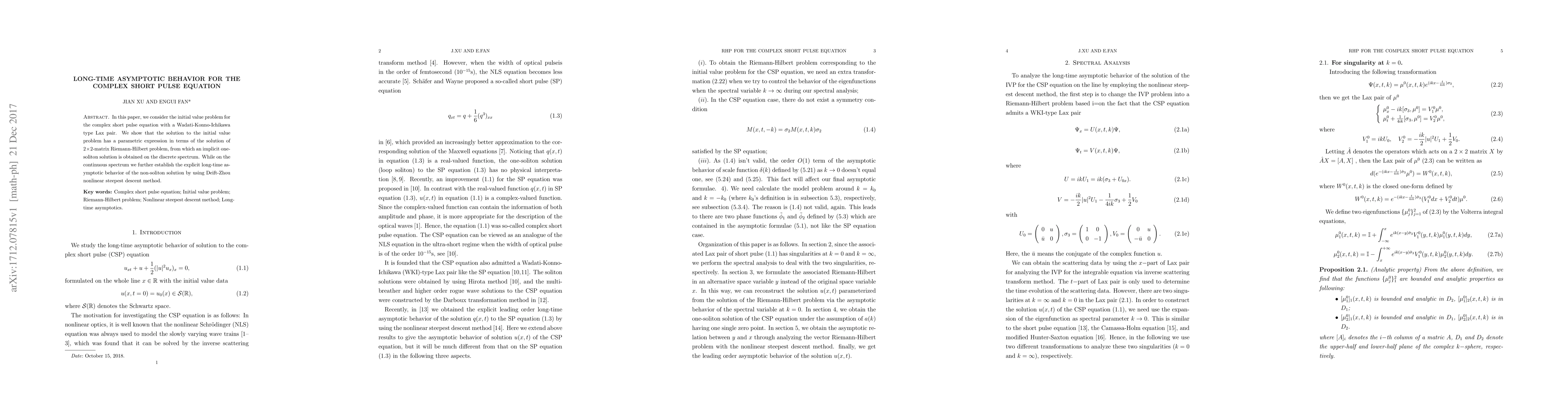 In this paper, we consider the initial value problem for the complex short pulse equation with a Wadati-Konno-Ichikawa type Lax pair. We show that the solution to the initial value problem has a parametric expression in terms of the solution of $2\times 2$-matrix Riemann-Hilbert problem, from which an implicit one-soliton solution is obtained on the discrete spectrum. While on the continuous spectrum we further establish the explicit long-time asymptotic behavior of the non-soliton solution by using Deift-Zhou nonlinear steepest descent method.