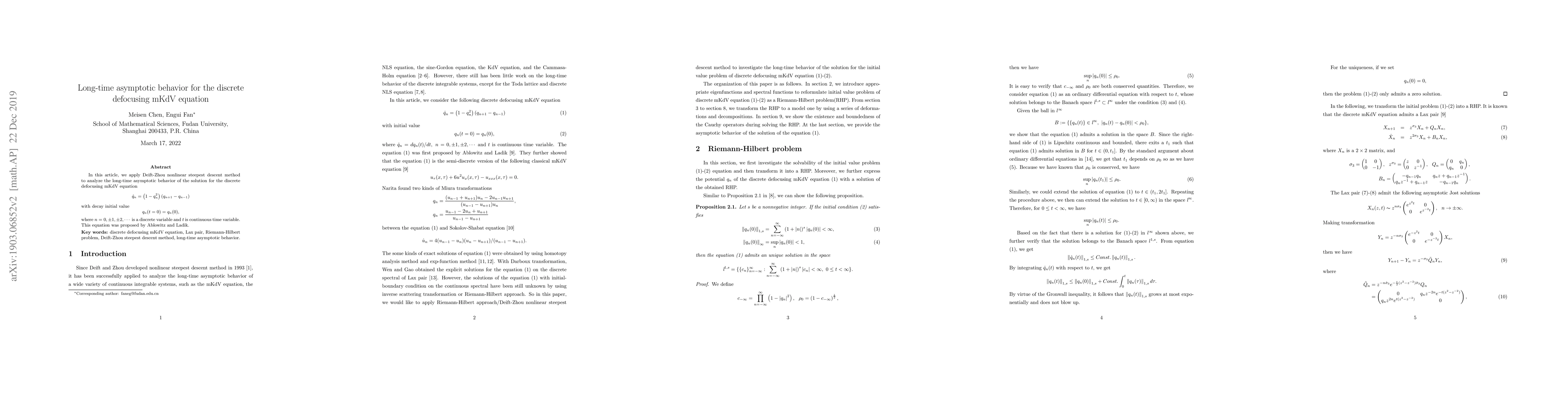 In this article, we apply Deift-Zhou nonlinear steepest descent method to analyze the long-time asymptotic behavior of the solution for the discrete defocusing mKdV equation. This equation was proposed by Ablowitz and Ladik.