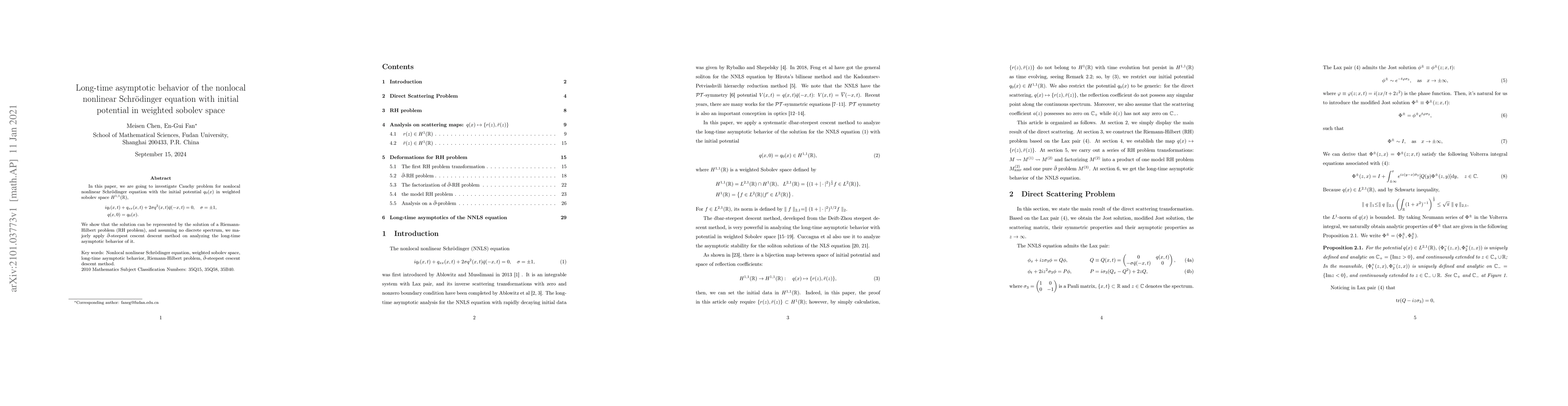 In this paper, we are going to investigate Cauchy problem for nonlocal nonlinear Schr\"odinger equation with the initial potential $q_0(x)$ in weighted sobolev space $H^{1,1}(\mathbb{R})$, \begin{align*} iq_t(x,t)&+q_{xx}(x,t)+2\sigma q^2(x,t)\bar q(-x,t)=0,\quad\sigma=\pm1,\\ q(x,0)&=q_0(x). \end{align*} We show that the solution can be represented by the solution of a Riemann-Hilbert problem (RH problem), and assuming no discrete spectrum, we majorly apply $\bar\partial$-steepest cescent descent method on analyzing the long-time asymptotic behavior of it.