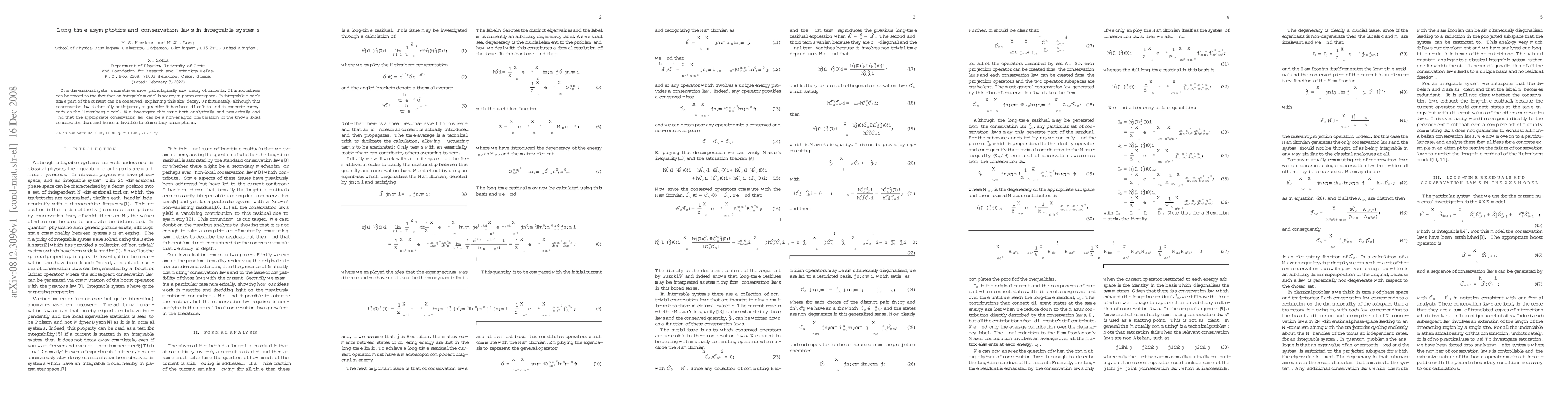 This paper explores the long-time asymptotics in integrable systems where currents decay slowly due to hidden conservation laws. It reveals that the actual conservation law is a complex, non-analytic combination of known local conservation laws, making it difficult to identify concretely, even in models like the Heisenberg model.
