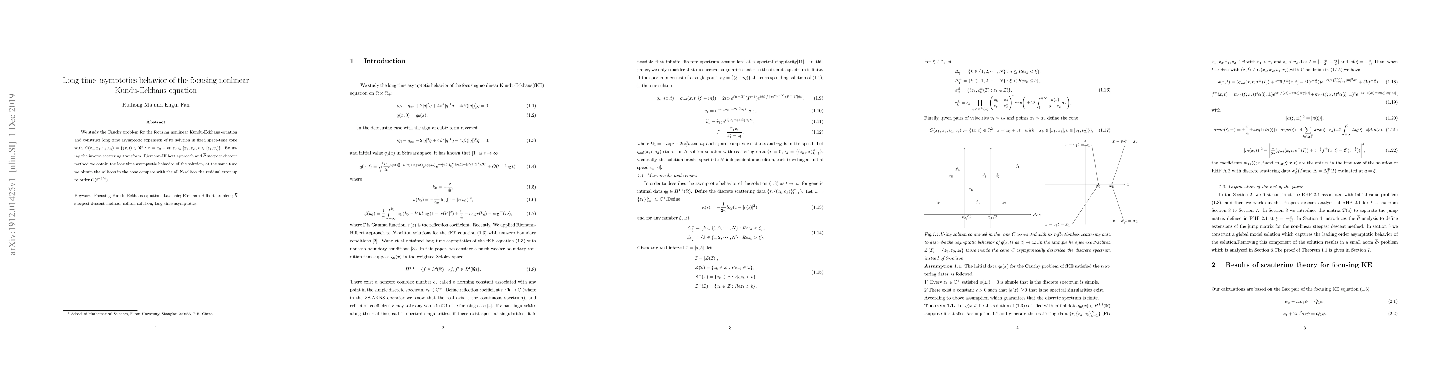 This paper investigates the long-time asymptotic behavior of solutions to the focusing nonlinear Kundu-Eckhaus equation using the inverse scattering transform, Riemann-Hilbert approach, and $\overline\partial$ steepest descent method, revealing soliton solutions and residual error up to $\mathcal{O}(t^{-3/4})$.