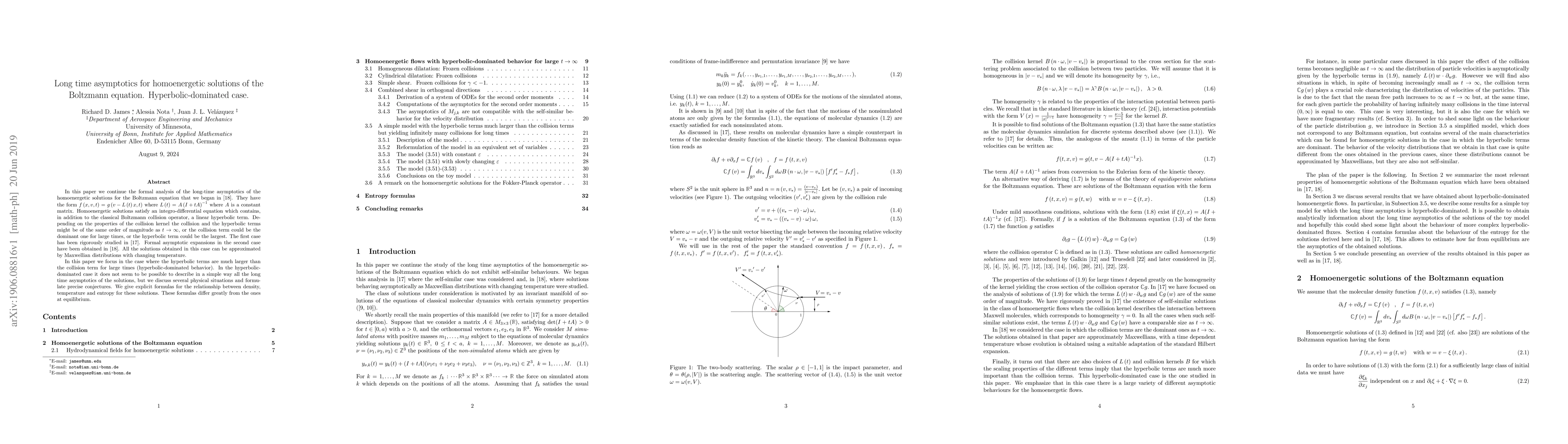 This paper investigates the long-time asymptotics of homoenergetic solutions to the Boltzmann equation in the hyperbolic-dominated case, where hyperbolic terms significantly exceed collision terms. The authors provide explicit formulas for density, temperature, and entropy, highlighting significant deviations from equilibrium behavior.