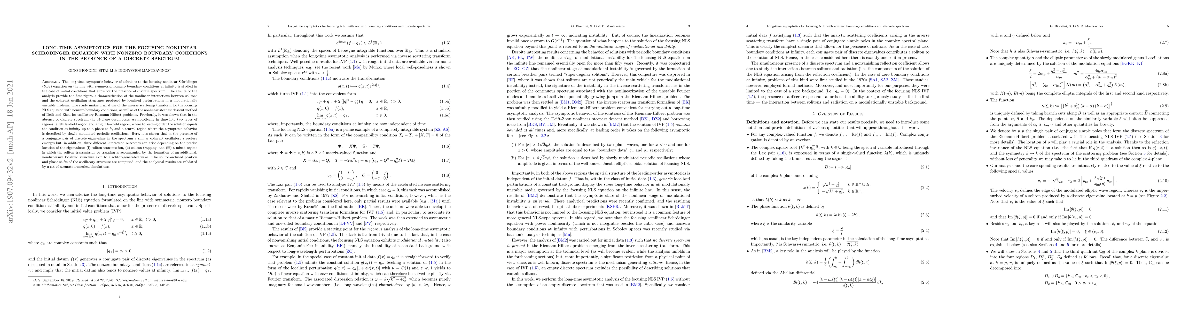 The long-time asymptotic behavior of solutions to the focusing nonlinear Schr\"odinger (NLS) equation on the line with symmetric, nonzero boundary conditions at infinity is studied in the case of initial conditions that allow for the presence of discrete spectrum. The results of the analysis provide the first rigorous characterization of the nonlinear interactions between solitons and the coherent oscillating structures produced by localized perturbations in a modulationally unstable medium. The study makes crucial use of the inverse scattering transform for the focusing NLS equation with nonzero boundary conditions, as well as of the nonlinear steepest descent method of Deift and Zhou for oscillatory Riemann-Hilbert problems. Previously, it was shown that in the absence of discrete spectrum the $xt$-plane decomposes asymptotically in time into two types of regions: a left far-field region and a right far-field region, where to leading order the solution equals the condition at infinity up to a phase shift, and a central region where the asymptotic behavior is described by slowly modulated periodic oscillations. Here, it is shown that in the presence of a conjugate pair of discrete eigenvalues in the spectrum a similar coherent oscillatory structure emerges but, in addition, three different interaction outcomes can arise depending on the precise location of the eigenvalues: (i) soliton transmission, (ii) soliton trapping, and (iii) a mixed regime in which the soliton transmission or trapping is accompanied by the formation of an additional, nondispersive localized structure akin to a soliton-generated wake. The soliton-induced position and phase shifts of the oscillatory structure are computed, and the analytical results are validated by a set of accurate numerical simulations.