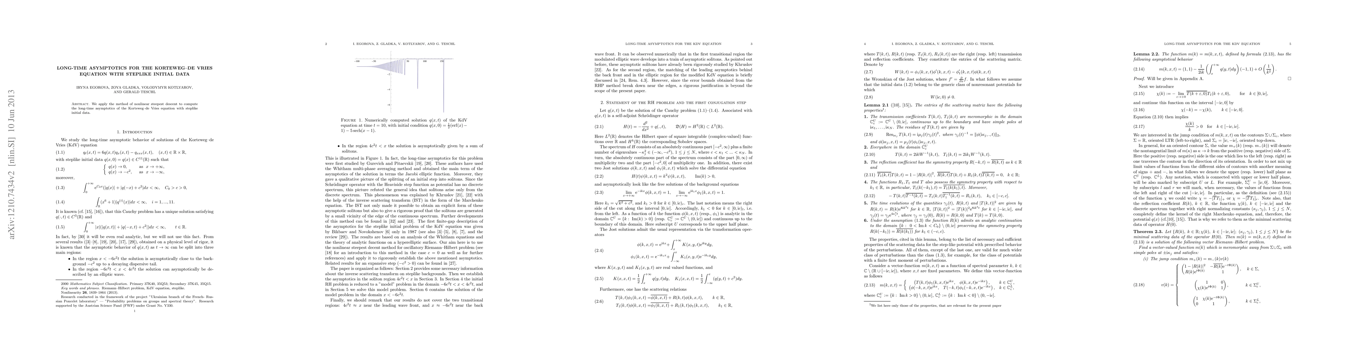 Summary: This paper utilizes the nonlinear steepest descent method to determine the long-time behavior of the Korteweg-de Vries equation when initiated with steplike data, providing insights into its asymptotic solutions.