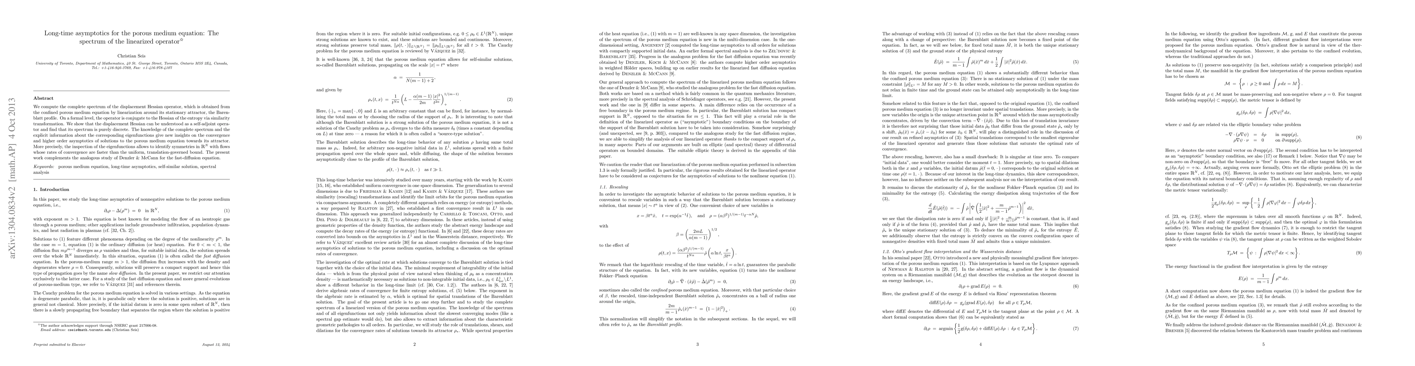 We compute the complete spectrum of the displacement Hessian operator, which is obtained from the confined porous medium equation by linearization around its stationary attractor, the Barenblatt profile. On a formal level, the operator is conjugate to the Hessian of the entropy via similarity transformation. We show that the displacement Hessian can be understood as a self-adjoint operator and find that its spectrum is purely discrete. The knowledge of the complete spectrum and the explicit information about the corresponding eigenfunctions give new insights on the convergence and higher order asymptotics of solutions to the porous medium equation towards its attractor. More precisely, the inspection of the eigenfunctions allows to identify symmetries in $\mathbbm{R}^N$ with flows whose rates of convergence are faster than the uniform, translation-governed bound. The present work complements the analogous study of Denzler & McCann for the fast-diffusion equation.