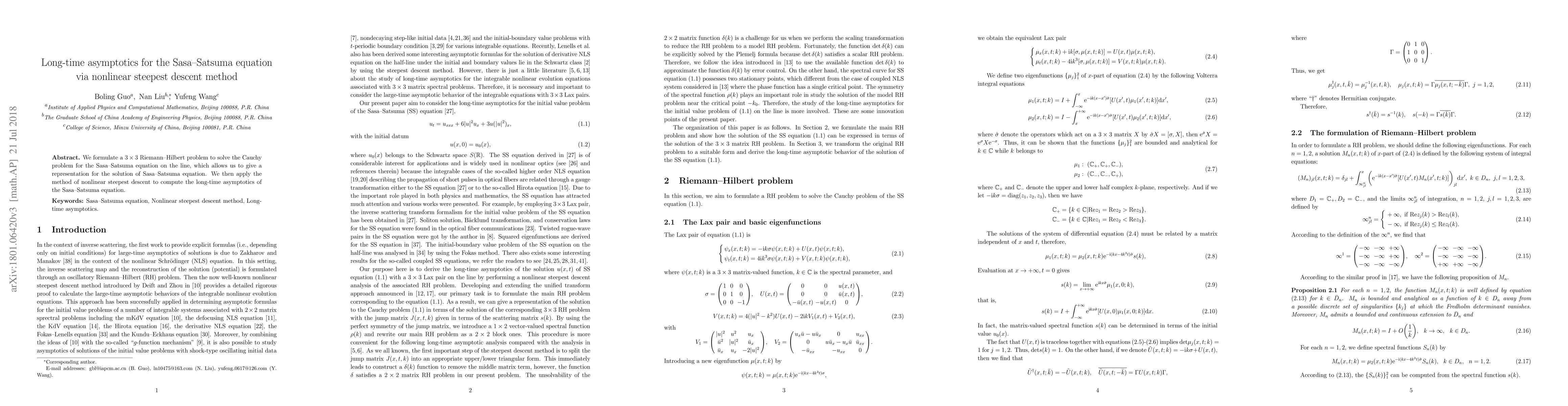 This paper formulates a $3\times3$ Riemann-Hilbert problem to solve the Sasa-Satsuma equation and employs the nonlinear steepest descent method to determine its long-time asymptotic behavior. The approach provides a comprehensive representation of the solution.