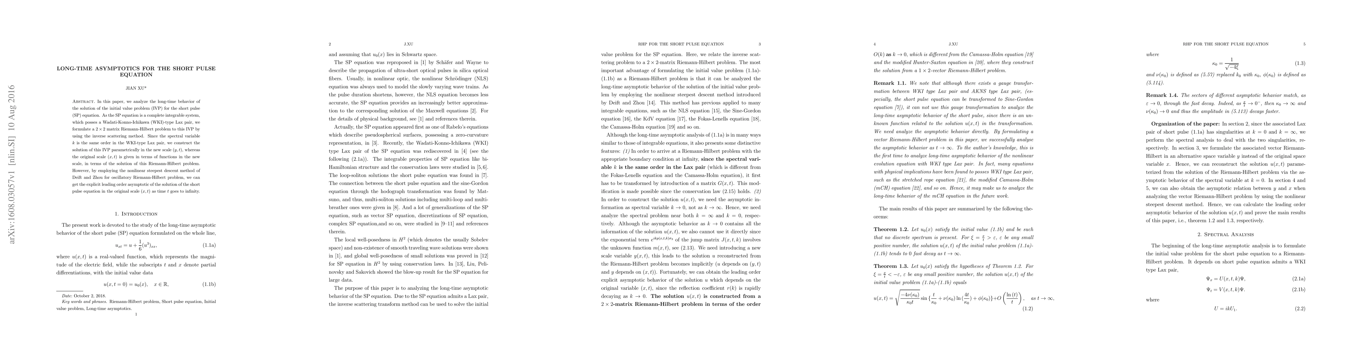 In this paper, we analyze the long-time behavior of the solution of the initial value problem (IVP) for the short pulse (SP) equation. As the SP equation is a complete integrable system, which posses a Wadati-Konno-Ichikawa (WKI)-type Lax pair, we formulate a $2\times 2$ matrix Riemann-Hilbert problem to this IVP by using the inverse scattering method. Since the spectral variable $k$ is the same order in the WKI-type Lax pair, we construct the solution of this IVP parametrically in the new scale $(y,t)$, whereas the original scale $(x,t)$ is given in terms of functions in the new scale, in terms of the solution of this Riemann-Hilbert problem. However, by employing the nonlinear steepest descent method of Deift and Zhou for oscillatory Riemann-Hilbert problem, we can get the explicit leading order asymptotic of the solution of the short pulse equation in the original scale $(x,t)$ as time $t$ goes to infinity.