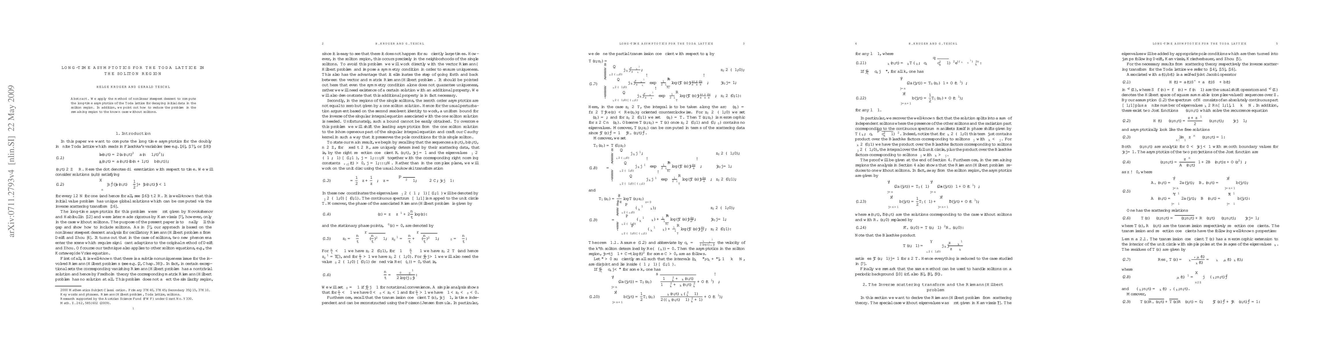 We apply the method of nonlinear steepest descent to compute the long-time asymptotics of the Toda lattice for decaying initial data in the soliton region. In addition, we point out how to reduce the problem in the remaining region to the known case without solitons.