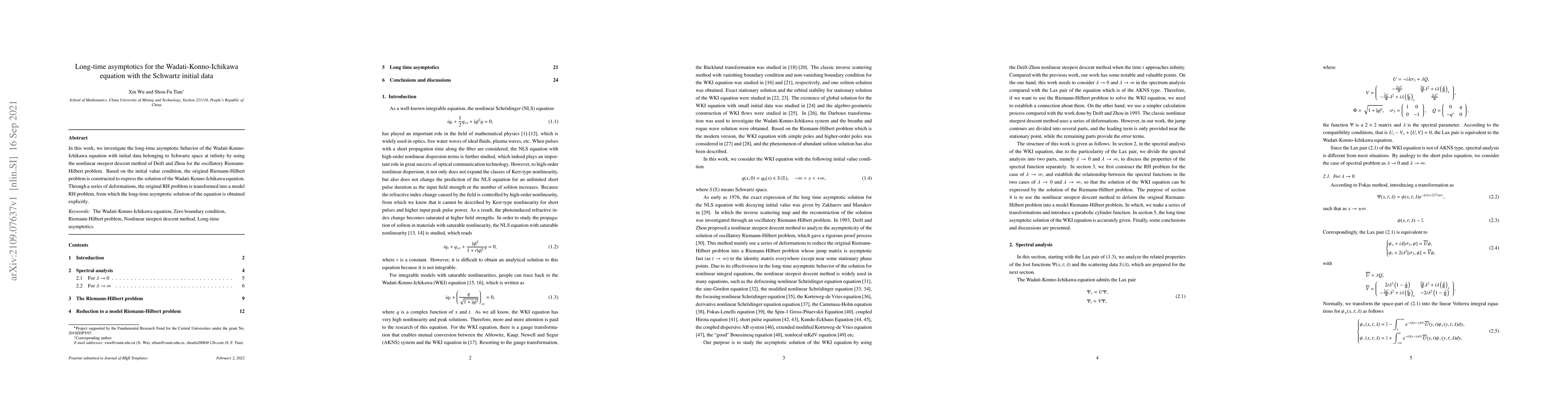 In this work, we investigate the long-time asymptotic behavior of the Wadati-Konno-Ichikawa equation with initial data belonging to Schwartz space at infinity by using the nonlinear steepest descent method of Deift and Zhou for the oscillatory Riemann-Hilbert problem. Based on the initial value condition, the original Riemann-Hilbert problem is constructed to express the solution of the Wadati-Konno-Ichikawa equation. Through a series of deformations, the original RH problem is transformed into a model RH problem, from which the long-time asymptotic solution of the equation is obtained explicitly.