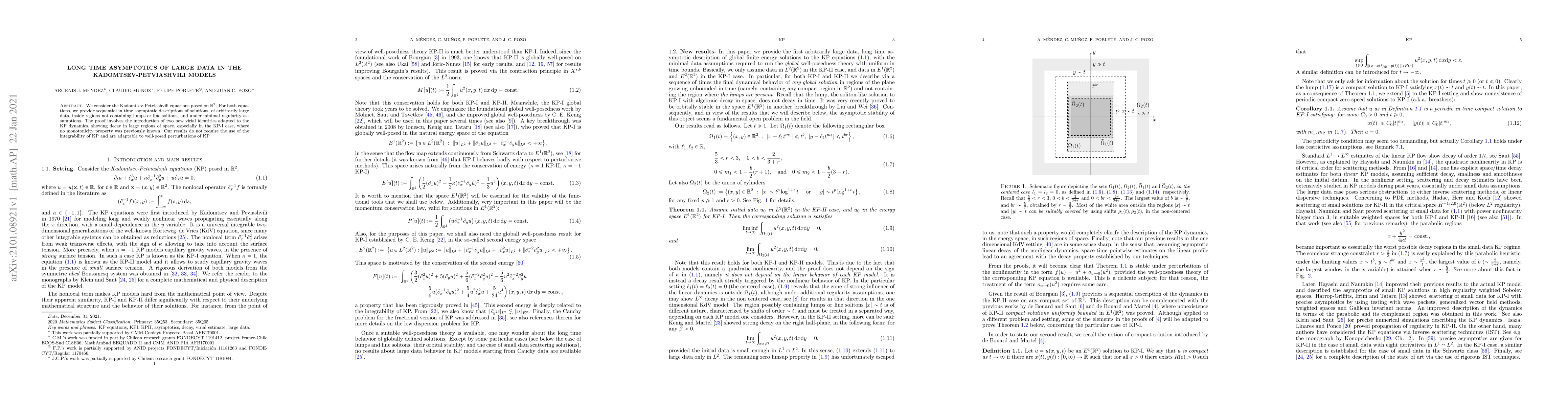 This paper studies the long time asymptotics of solutions to the Kadomtsev-Petviashvili (KP) equations, providing detailed descriptions for large initial data without requiring the integrability of KP. The authors introduce new virial identities to demonstrate decay properties, particularly in the KP-I case.