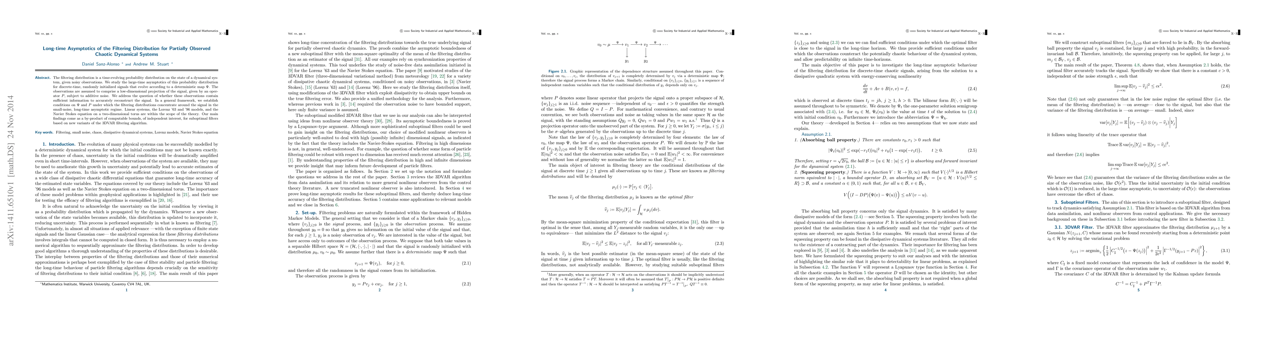 This paper investigates the long-term behavior of filtering distributions for partially observed chaotic dynamical systems, establishing conditions under which these distributions concentrate around the true signal in the small-noise, long-time limit. The study provides computable bounds for suboptimal filters, applicable to systems like the Lorenz and Navier-Stokes models.